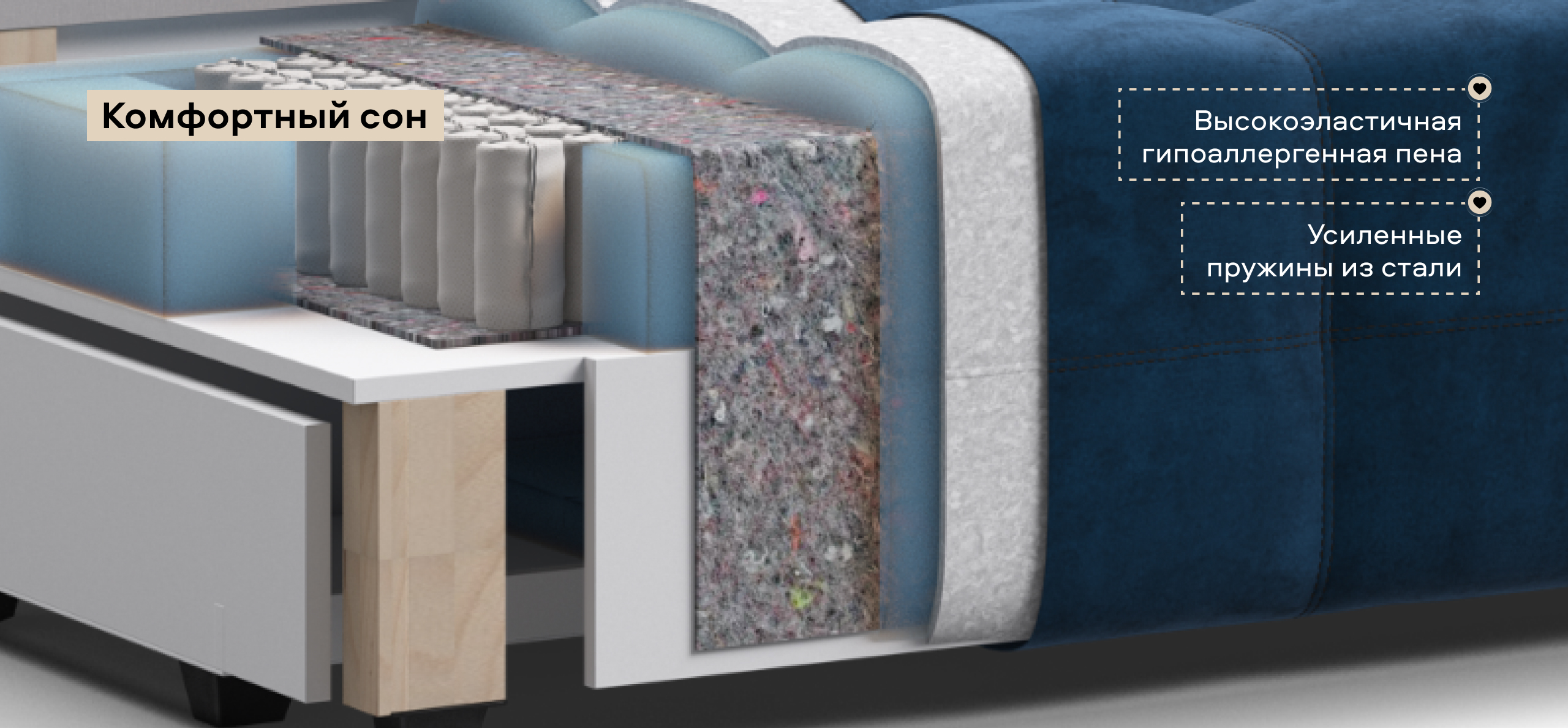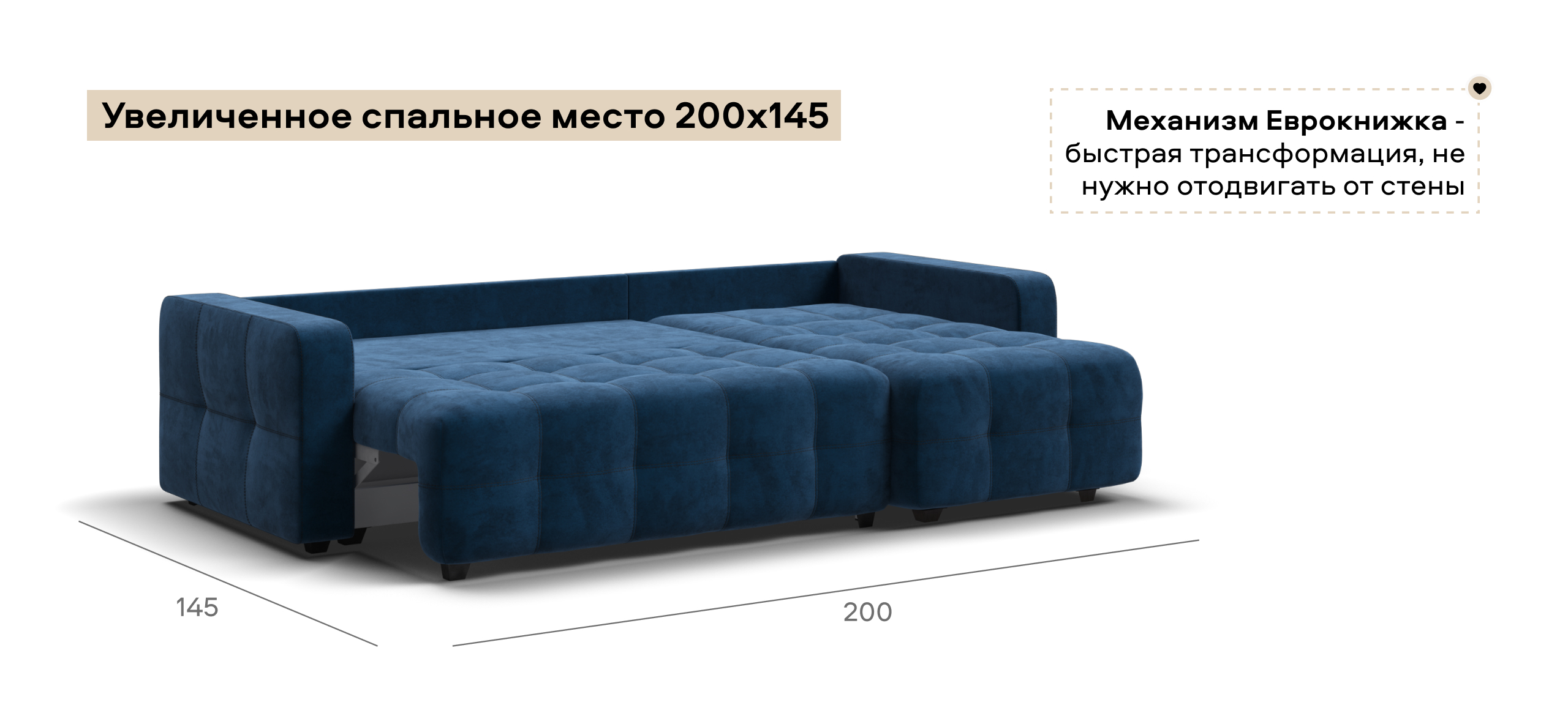 Простой и надежный механизм трансформации еврокнижка позволяет с легкостью раскладывать диван в удобную, полноценную, двуспальную кровать.