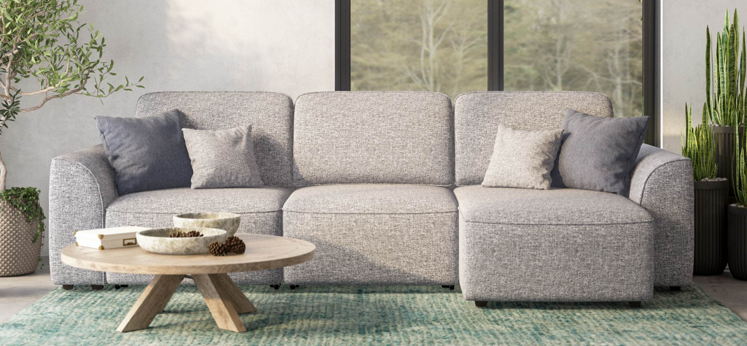 Комфортная посадка, скругленные линии, объемные подушки - диван, который наполнит ваш дом уютом и комфортом. Универсальный угол позволит Вам самостоятельно выбрать его положение при сборке, а каждое посадочное место можно выдвинуть вперед и получить П-образную форму дивана, на котором с комфортом разместится большая компания. А в разложенном виде диван превращается в комфортное спальное место.