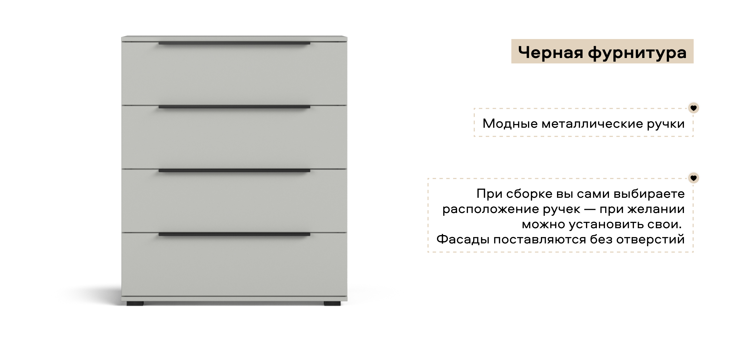 Трендовые оттенки Шиншилла серая, Кашемир серый и Белый будут выглядеть уместно в любом интерьере, а черная металлическая фурнитура добавляет стиля и вкуса этой коллекции. Мебель выглядит достойно, и подчеркивает изысканный вкус владельца.
