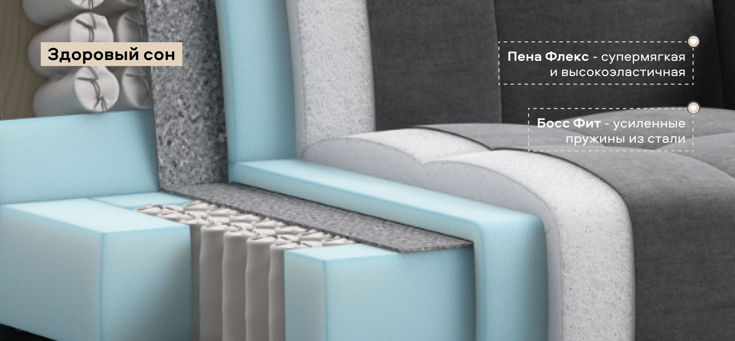 Инновационный анатомический матрас BOSS Quality в диване, высотой 15 см., выполнен из полноценного независимого пружинного блока Босс Фит и высокоэластичной пены Флекс – гарантия здорового сна, как на кровати!