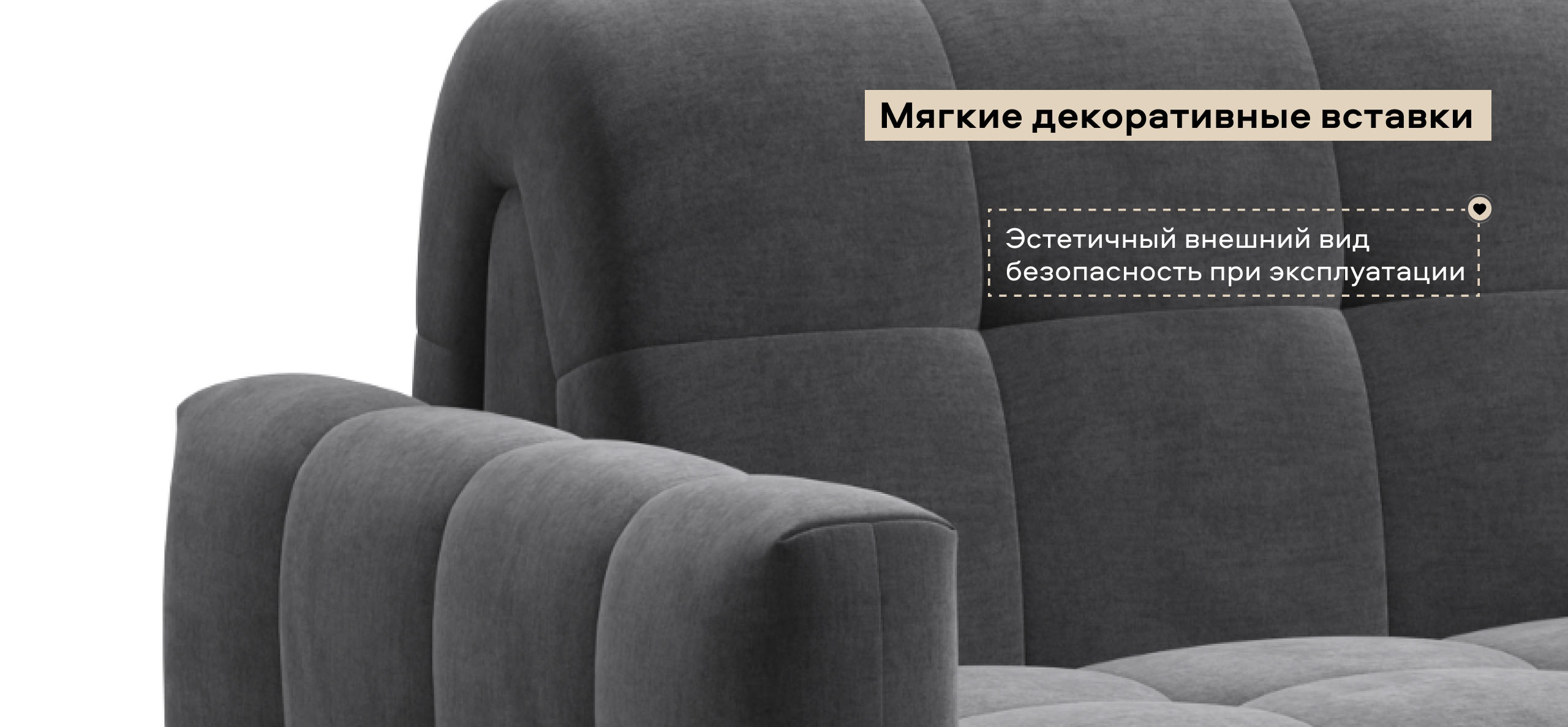Мягкие декоративные вставки на боковых частях дивана закрывают механизм в сложенном и в разложенном виде, придавая дивану эстетичный внешний вид и безопасность при эксплуатации