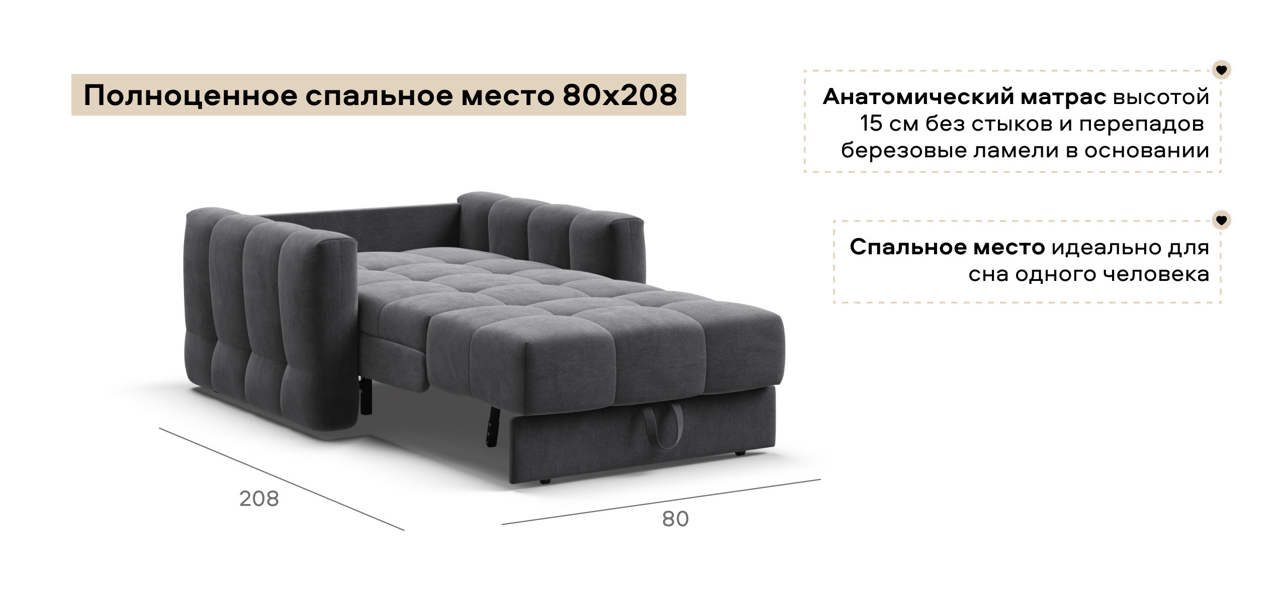 Полноценное спальное место для одного человека, без стыков и перепадов с березовыми ламелями в основании - как кровать.
