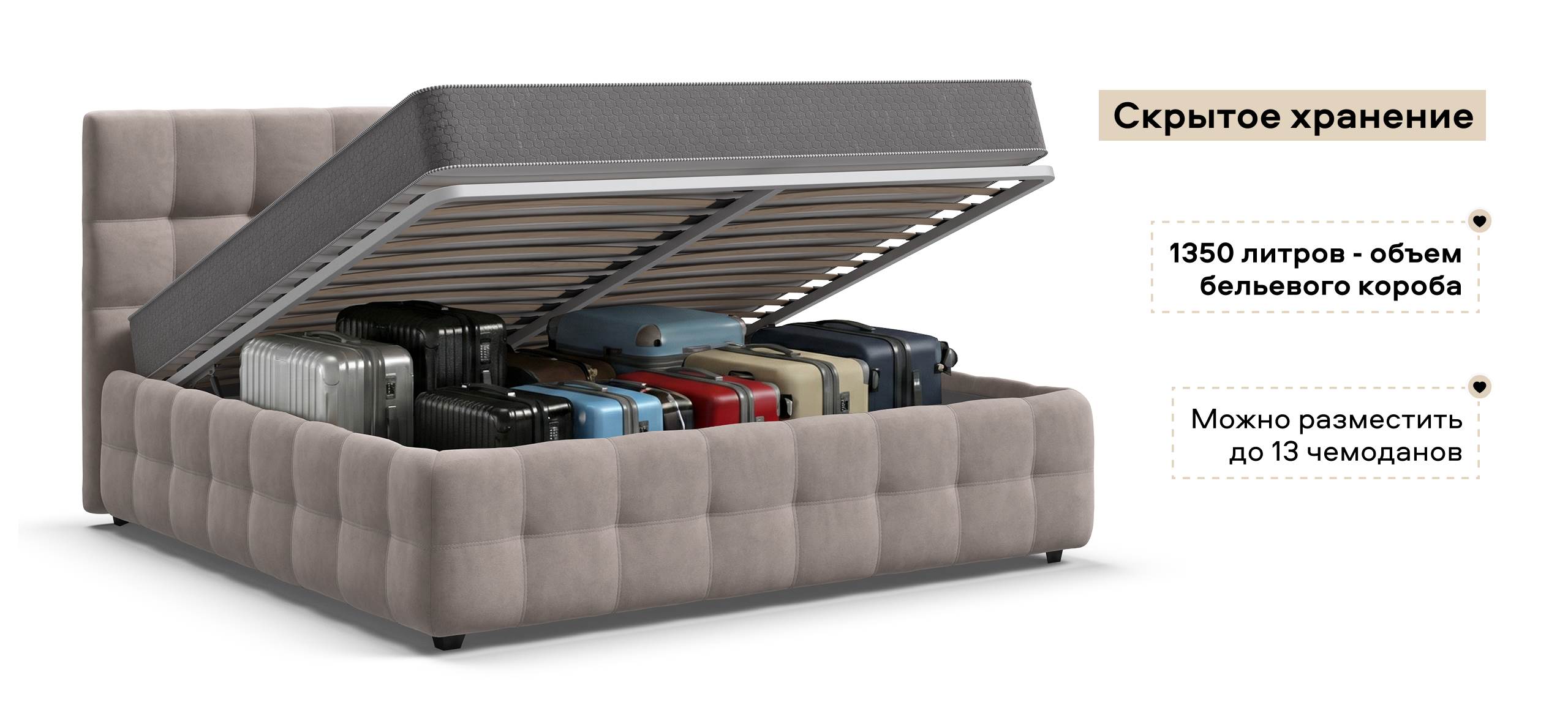 Одним из главных преимуществ кровати Босс является её усиленное ортопедическое основание HEALTHY SLEEP, которое обеспечивает правильную поддержку позвоночника и улучшает качество сна. Благодаря вместительному отсеку для хранения HideBox, объёмом в 1250 литров, у вас будет достаточно пространства для хранения постельного белья и других вещей, что позволяет максимально эффективно использовать пространство спальни.