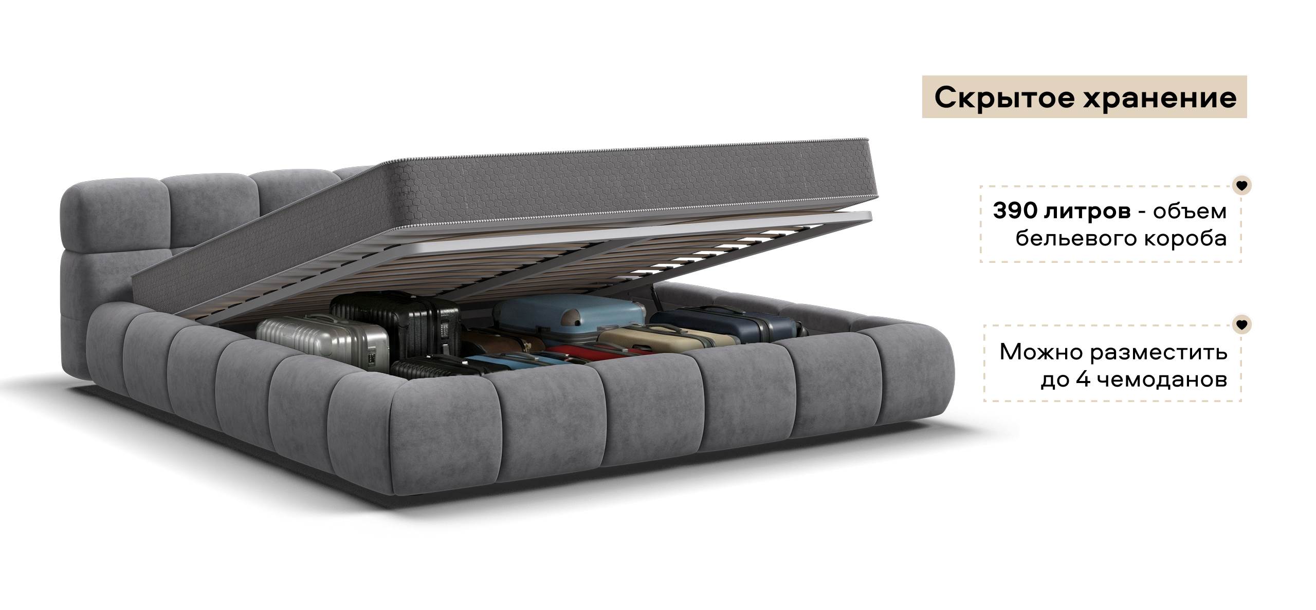 HideBox - отсек для хранения полезных вещей объемом 340 литров что ровняется примерно 4 чемоданам.