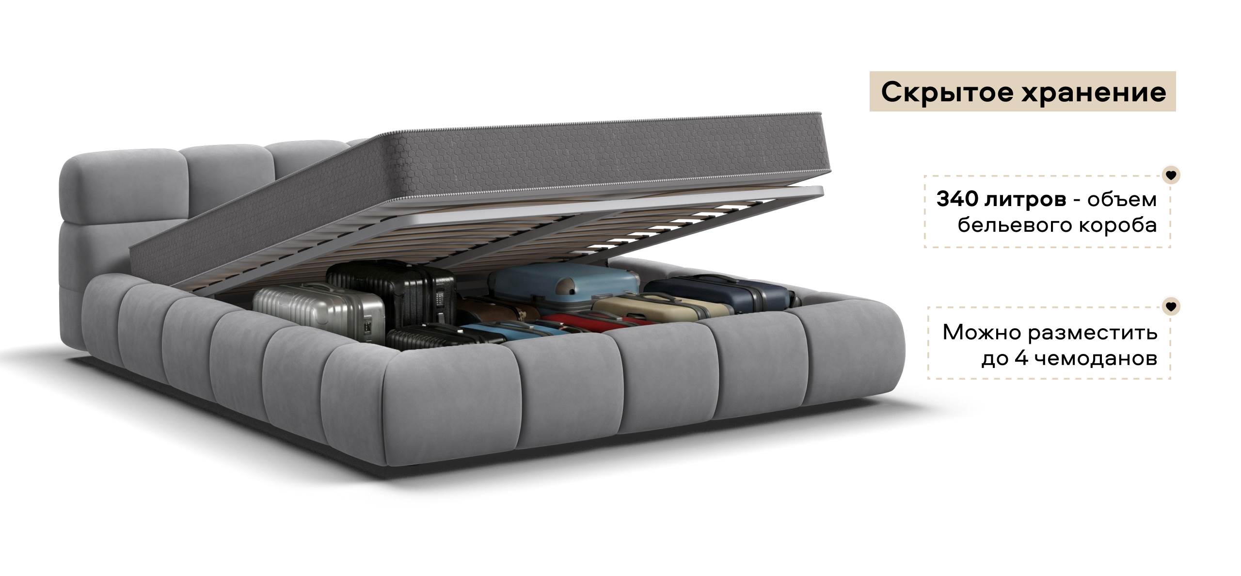 HideBox - отсек для хранения полезных вещей объемом 340 литров что ровняется примерно 4 чемоданам.