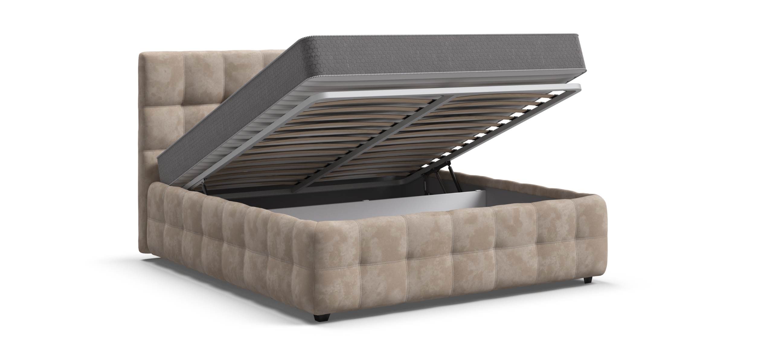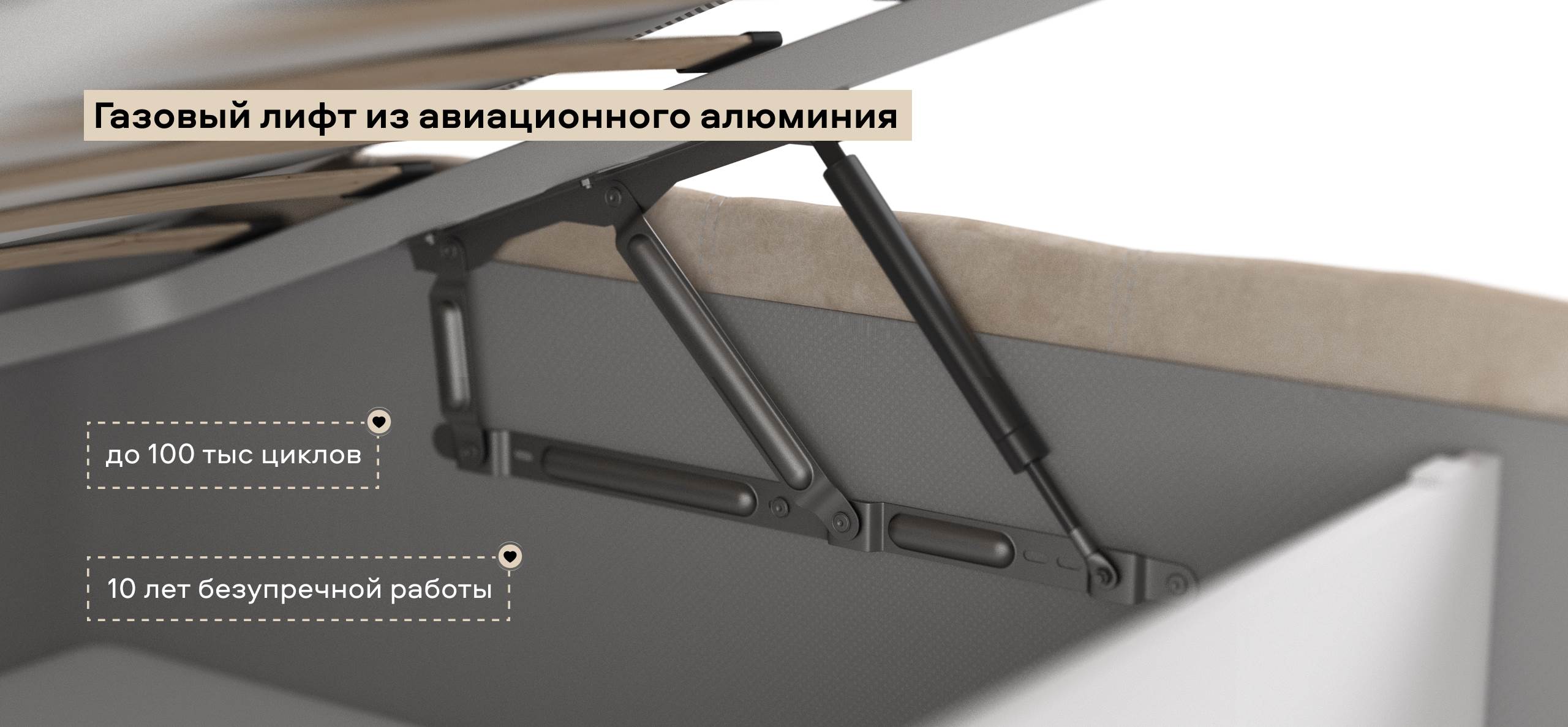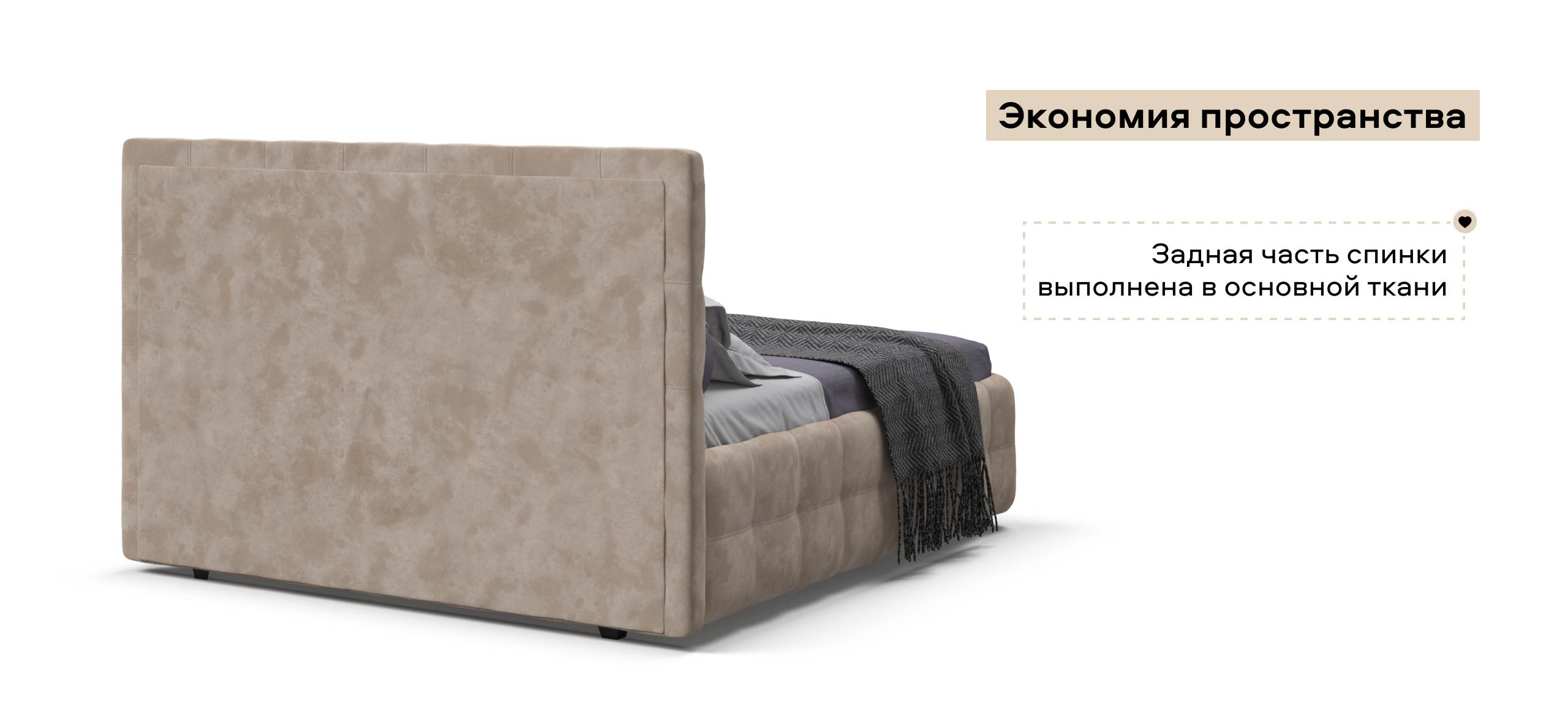 Особое внимание заслуживают газовые лифты SpaceLift, изготовленные из авиационного алюминия. Они обеспечивают лёгкое и плавное поднятие матраса, что делает доступ к отсеку для хранения быстрым и удобным. Дизайн 360 предполагает, что задняя часть спинки кровати также выполнена из основной ткани, что позволяет размещать кровать не только у стены, но и в центре комнаты, сохраняя при этом её эстетическую привлекательность.