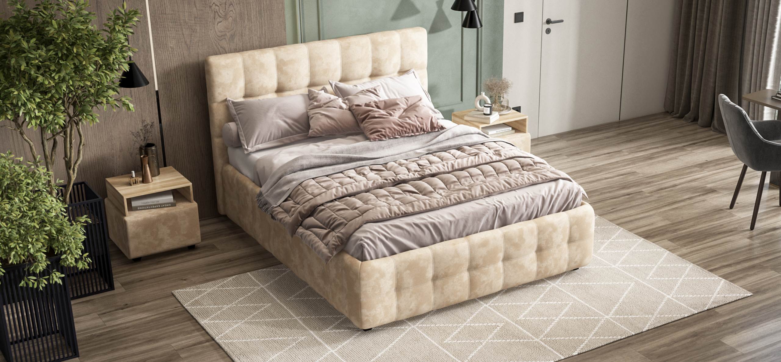 Кровать Босс — это воплощение элегантности и минимализма. Её лаконичный дизайн, подчёркнутый мягким изголовьем с геометричным узором, делает эту кровать центральным элементом любой спальни. Комфортные обивки создают неповторимое ощущение уюта и способствуют полноценному отдыху.