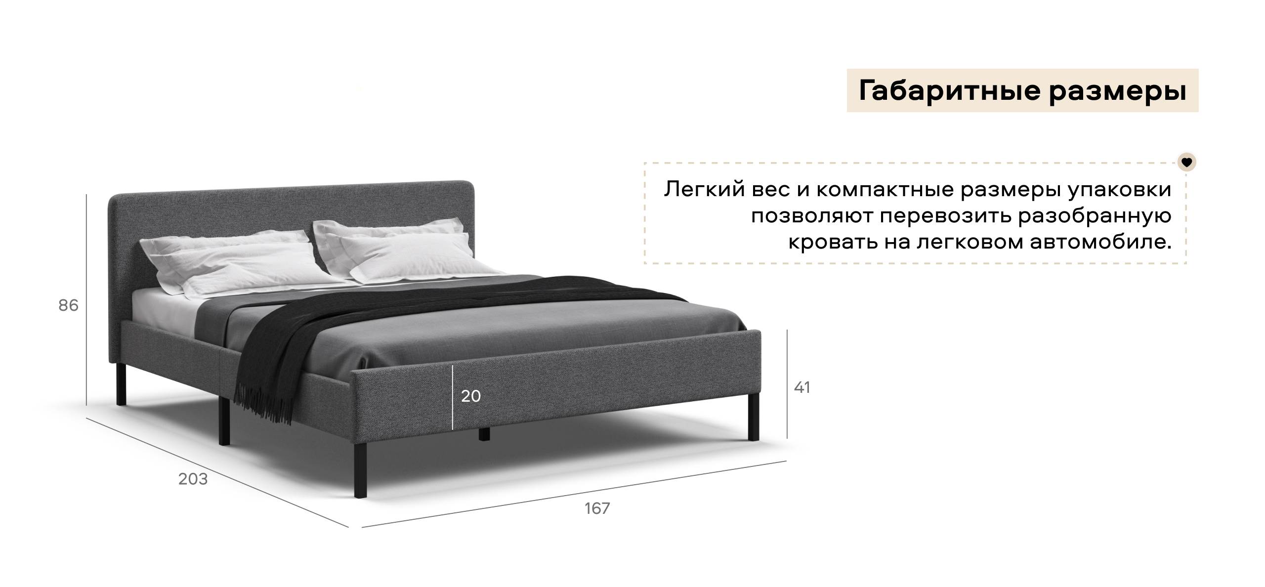 Кровать можно разобрать, переместить и снова собрать много раз, без потери ее свойств. Легкий вес и компактные размеры упаковки позволяют перевозить разобранную кровать на легковом автомобиле.