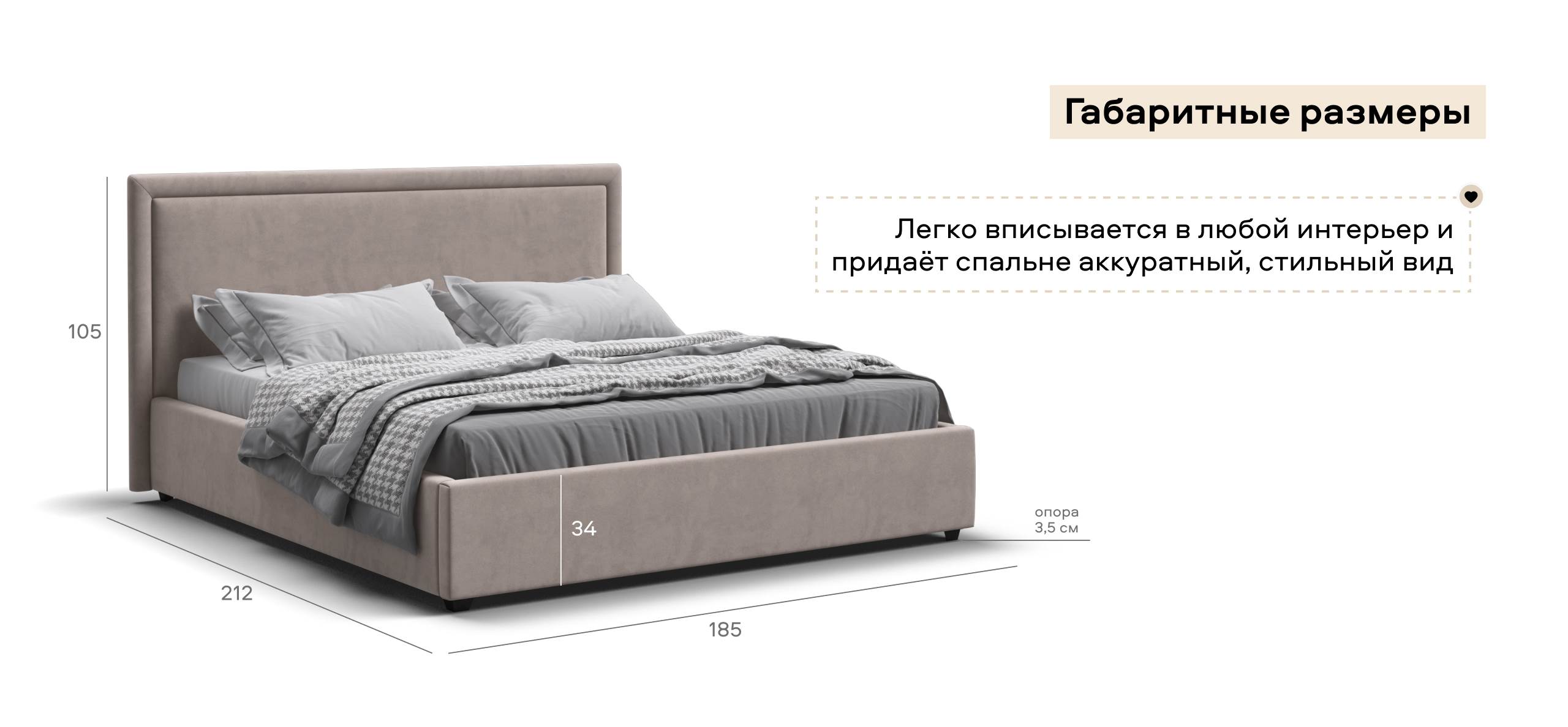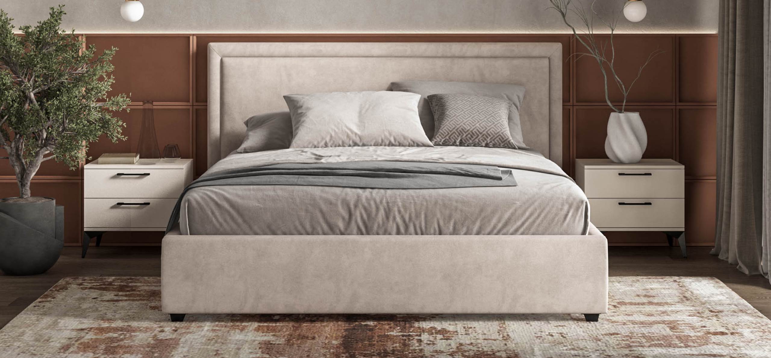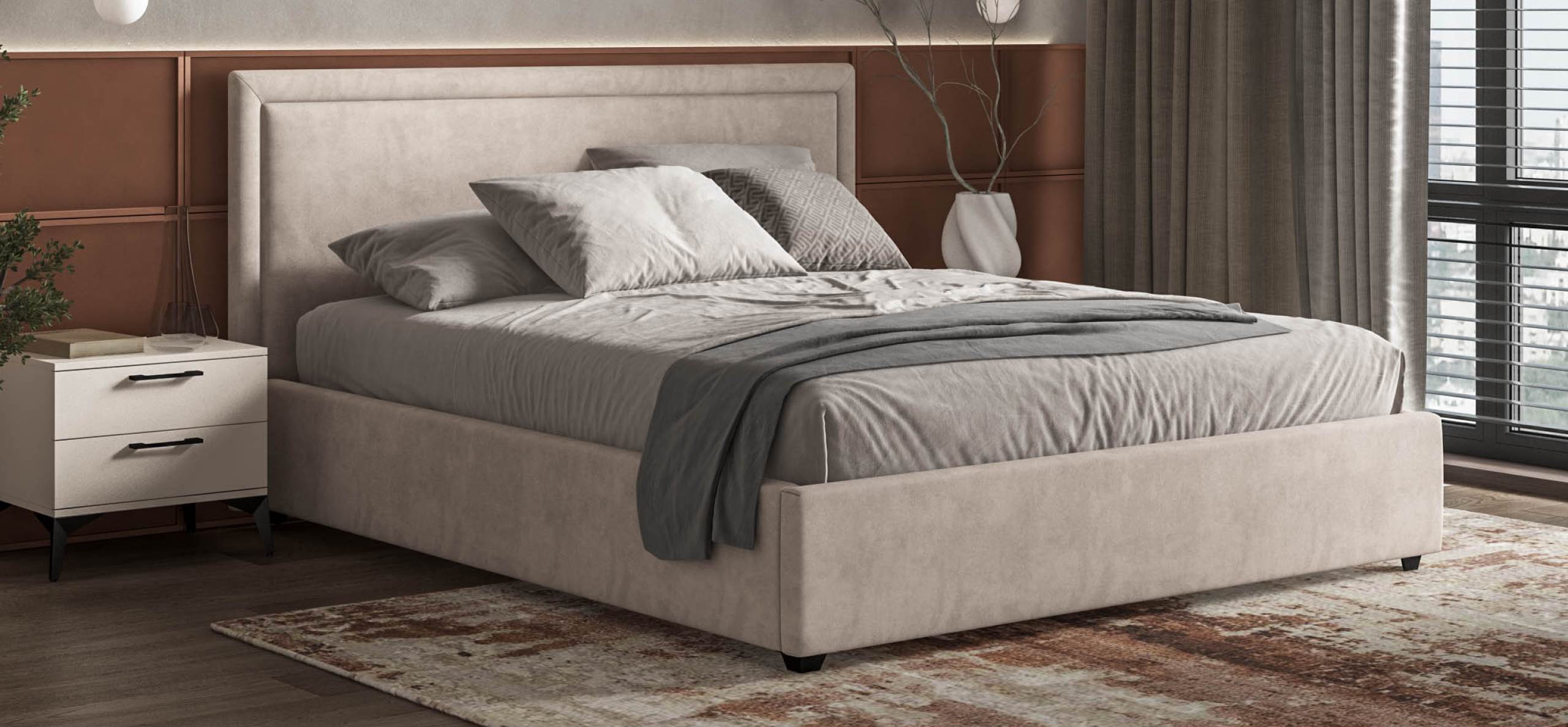 Эта кровать создана для тех, кто ценит тишину, уют и безупречный порядок в пространстве. Она будто обнимает вас мягкими линиями и ненавязчивым, благородным силуэтом. Высокое изголовье с деликатным объемом приглашает устроиться поудобнее — почитать книгу, посмотреть сериал или просто отдохнуть, ощущая приятную упругость за спиной.