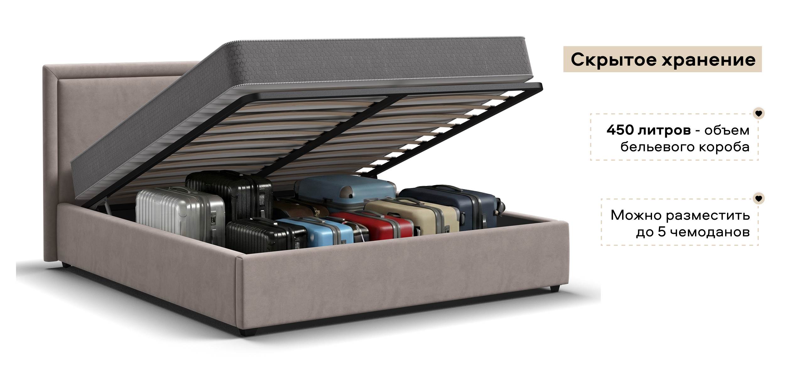 Под матрасом скрывается вместительное пространство для хранения, которое не выдает себя ни внешне, ни по звучанию — всё открывается легко и бесшумно. Это возможность освободить комнату от лишнего, сохранив только лёгкость и порядок вокруг.