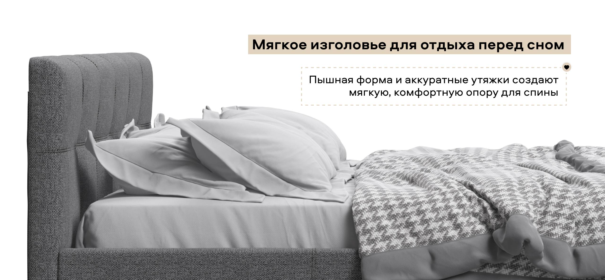 Мягкая спинка кровати удобна для чтения книг или просмотра сериалов перед сном, что добавляет дополнительный уровень комфорта. Дизайн кровати соответствует современным тенденциям: двойная стежка и утяжки на мягкой спинке подчеркивают изысканный вкус владельца, добавляя интерьеру спальни нотку роскоши.