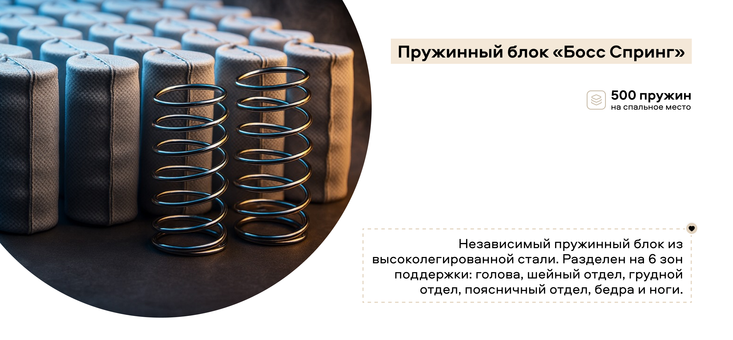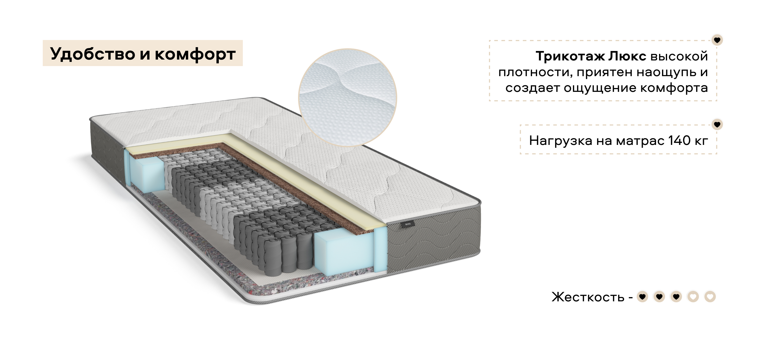 Матрас Босс Мини - это 6 зон комфорта и 500 независимых пружин. Матрас обеспечивает анатомическую поддержку позвоночника и создает прекрасные условия для полноценного здорового сна.