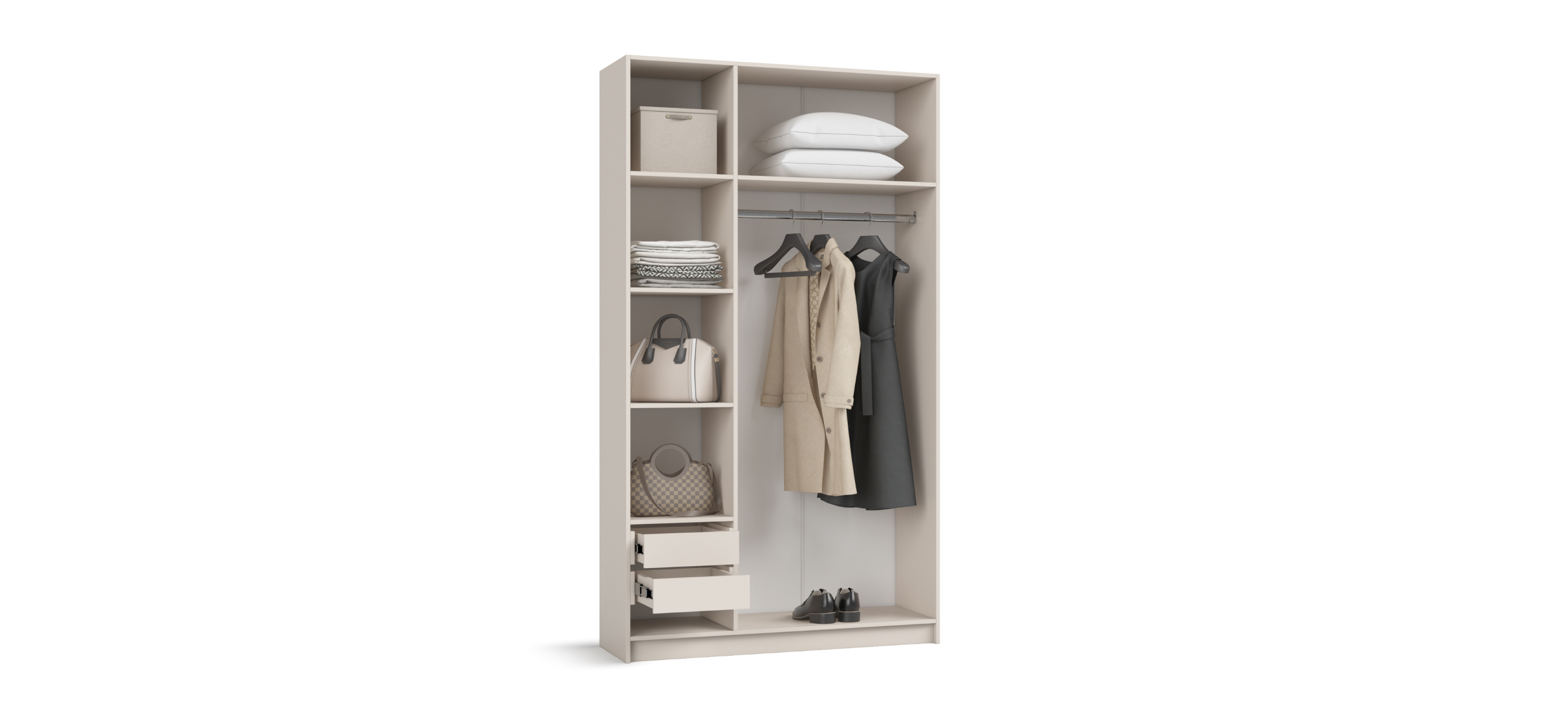 Гибкая конфигурация превращает Босс Стандарт 120 в личный конструктор хранения. Полки и два выдвижных ящика можно установить справа или слева — под планировку и ваши привычки. Двери с доводчиками открываются лёгким движением и закрываются плавно; ящики на шариковых направляющих выдвигаются бесшумно, не прерывая утренний ритм.