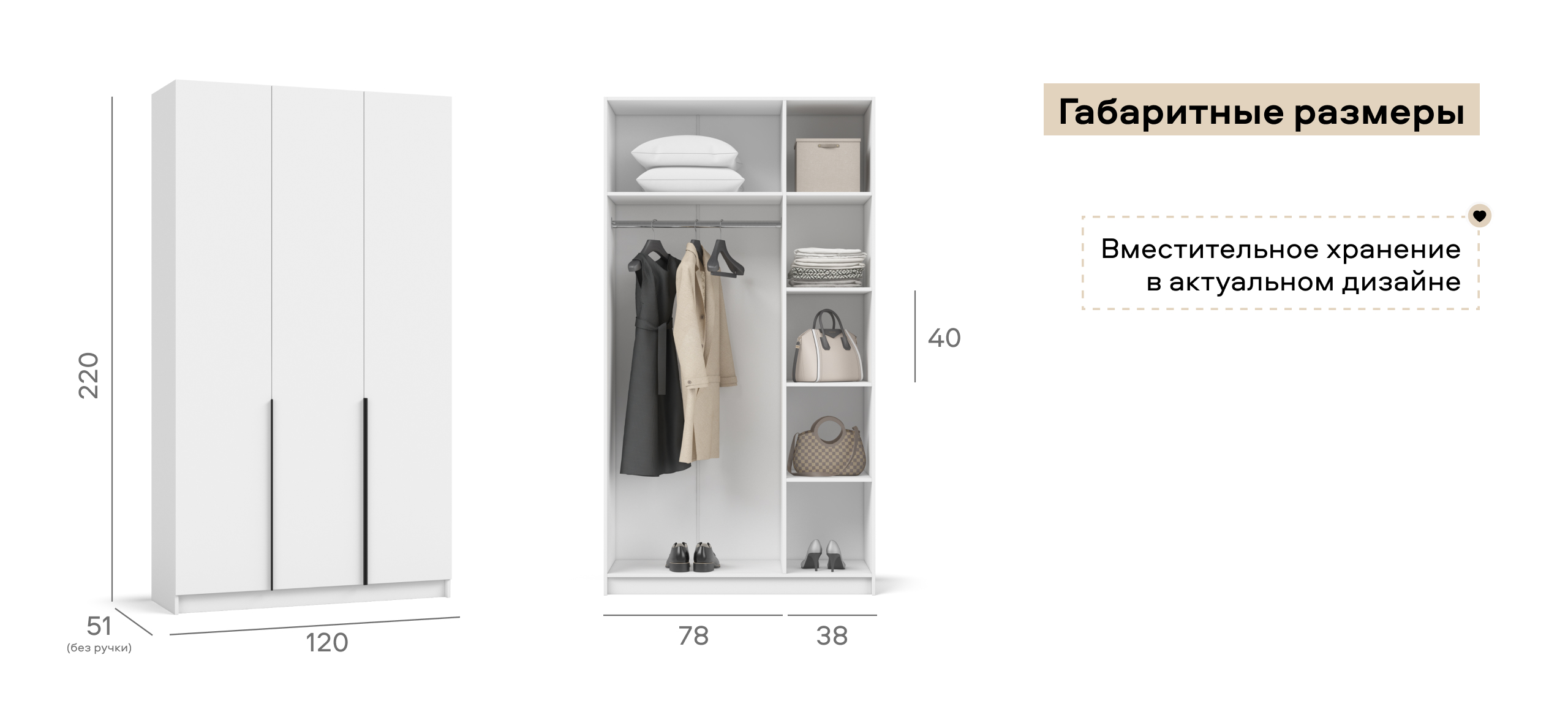 Внутри продуман каждый сантиметр: просторное отделение легко принимает сезонный гардероб, коробки с обувью и постельное бельё, сохраняя порядок и освобождая комнату от лишних вещей. Полки и штангу можно разместить как справа, так и слева, формируя удобную компоновку без лишних перестановок.