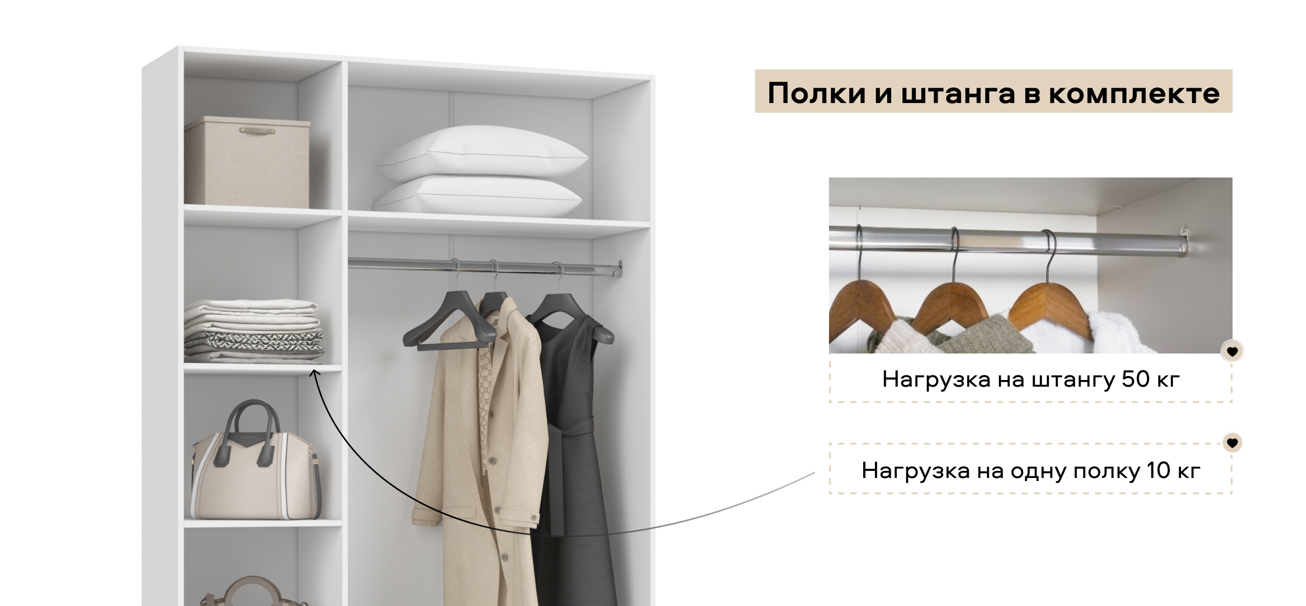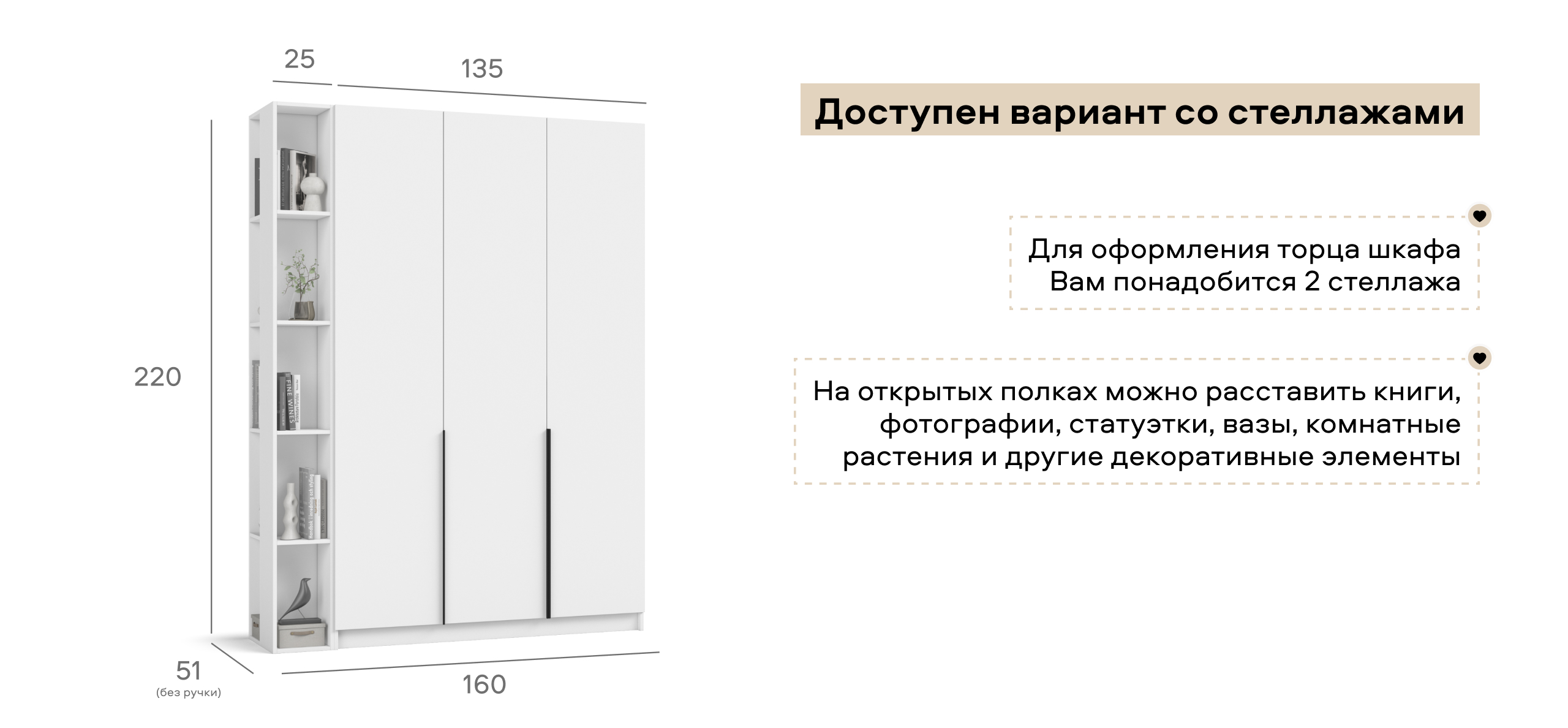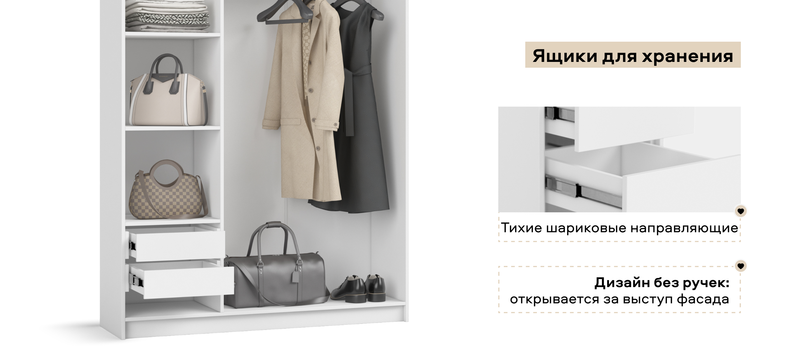 Гибкая компоновка превращает Босс Стандарт 135 в личный конструктор хранения. Полки и два выдвижных ящика можно установить справа или слева — по планировке и вашим привычкам. Двери с премиальными доводчиками открываются лёгким движением и закрываются плавно; ящики на шариковых направляющих выдвигаются бесшумно, не прерывая утренний ритм.