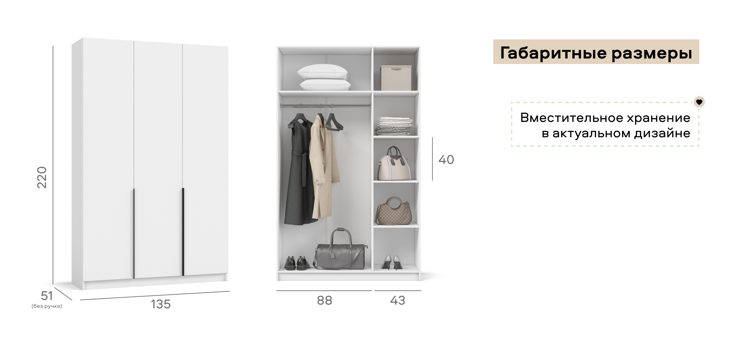 Внутри продуман каждый сантиметр: по бокам — полки на всю высоту для аккуратного текстиля и обувных коробок, в центре — штанга для длинной одежды. Полки легко переставляются, позволяя адаптировать пространство под сезонный гардероб без лишних перестановок.