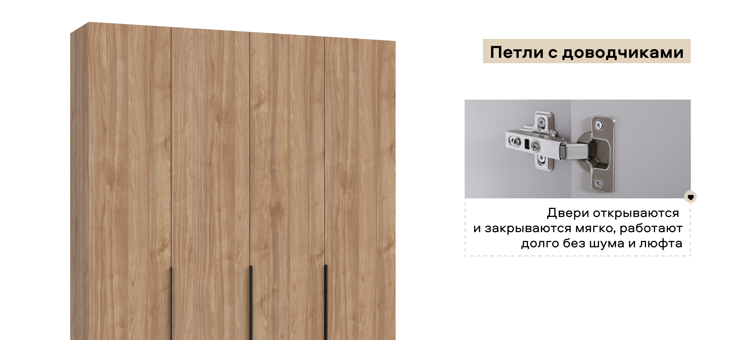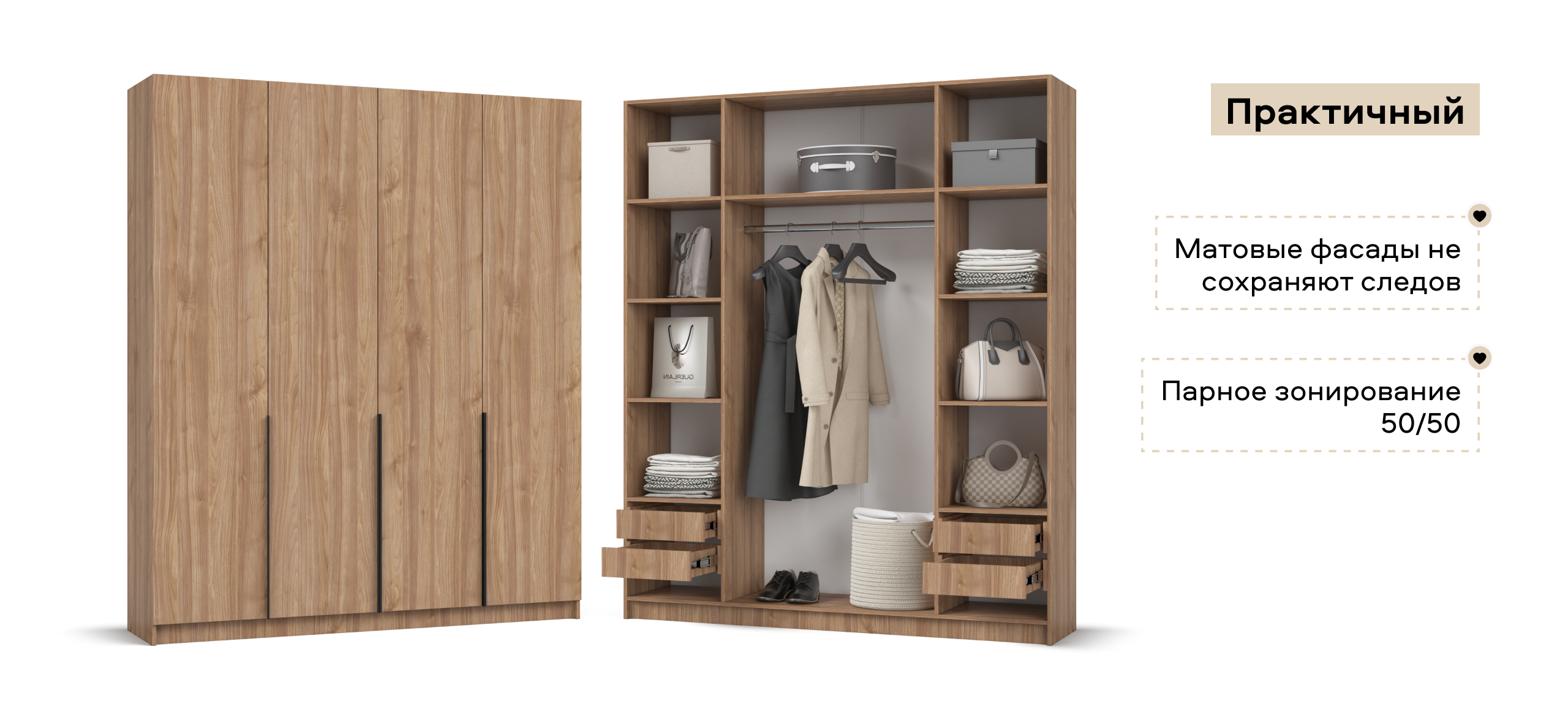 По бокам — две зеркальные секции: полки сверху, под ними — по два выдвижных ящика; в центре — штанга для длинной одежды. Двери с премиальными доводчиками закрываются мягко, а четыре ящика на шариковых направляющих выдвигаются легко и бесшумно, ускоряя поиск вещей и устраняя споры о «главной» стороне.