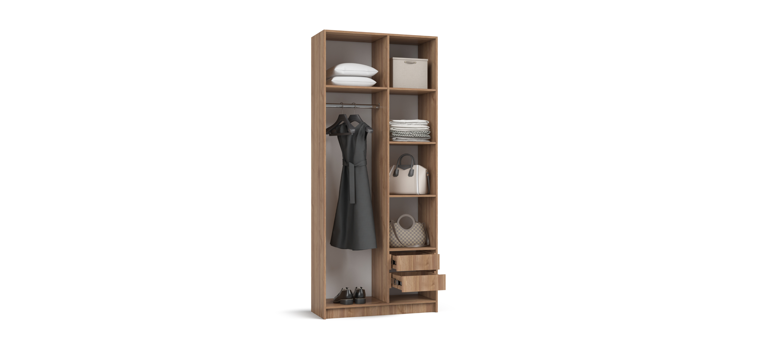 Гибкая компоновка превращает Босс Стандарт 90 в персональный конструктор хранения. Полки и два выдвижных ящика можно установить справа или слева — как подсказывает планировка и ваши привычки. Двери с доводчиками открываются лёгким движением и закрываются мягко; ящики на шариковых направляющих выдвигаются плавно и бесшумно, не нарушая утренний ритм.