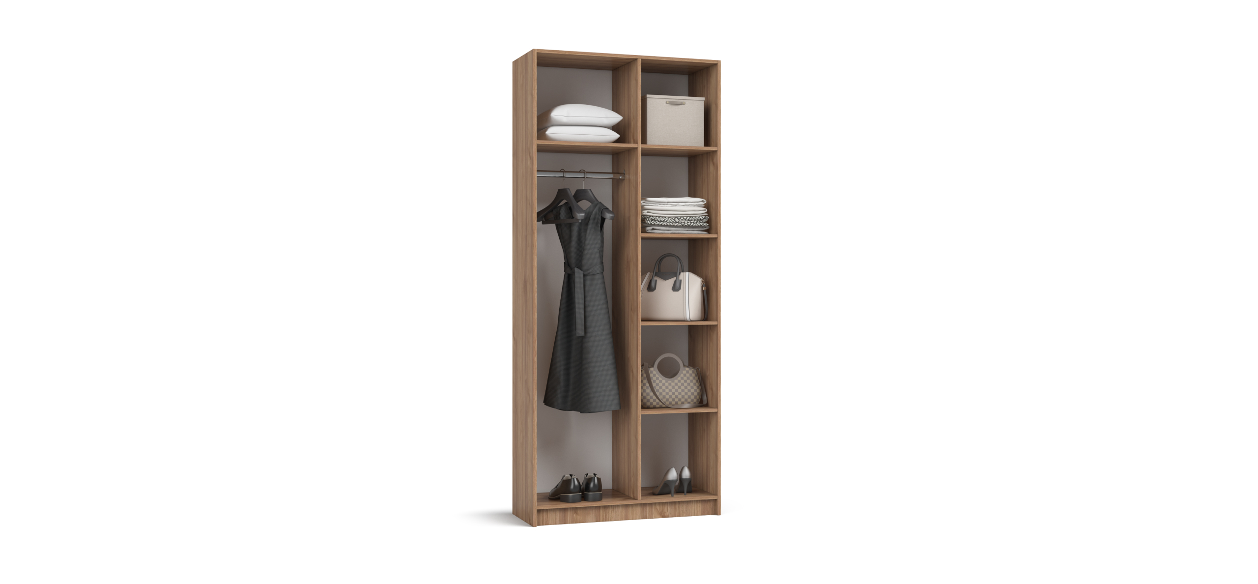 Гибкая компоновка превращает Босс Стандарт 90 в персональную систему хранения. Переставляемые полки можно расположить на нужной высоте — под планировку комнаты и ваши привычки. Двери с премиальными доводчиками открываются лёгким движением и закрываются мягко, не нарушая утренний ритм.