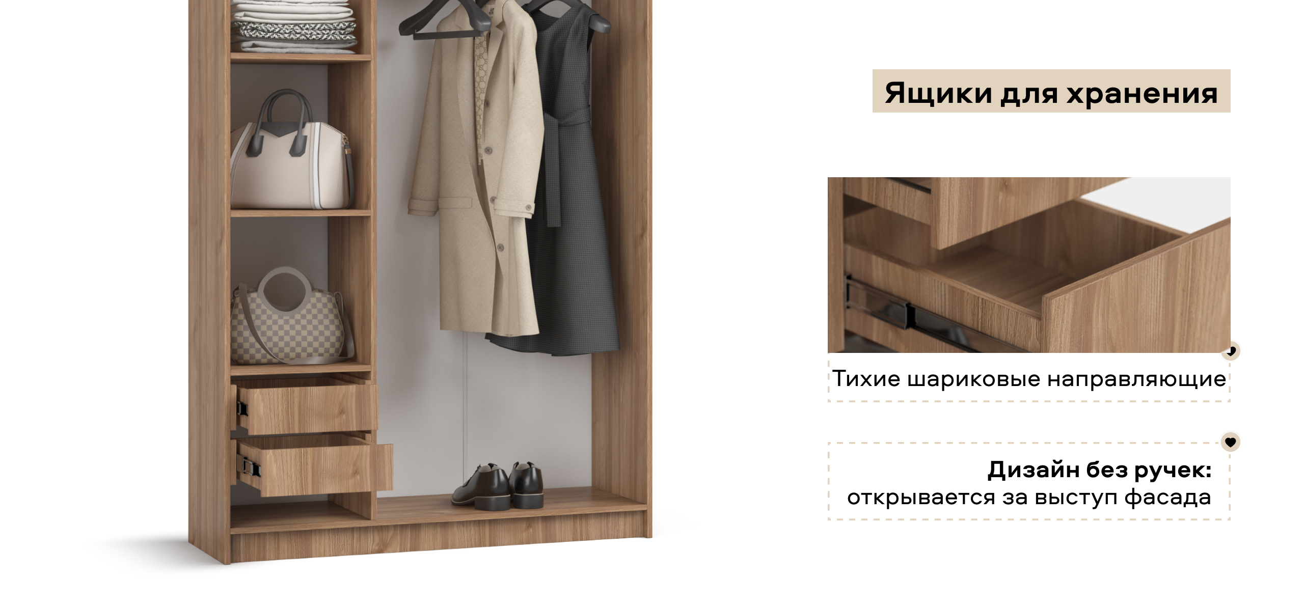 Ящики на шариковых направляющих Плавное и надёжное выдвижение даже при полной загрузке. Удобное решение для повседневного хранения без компромиссов