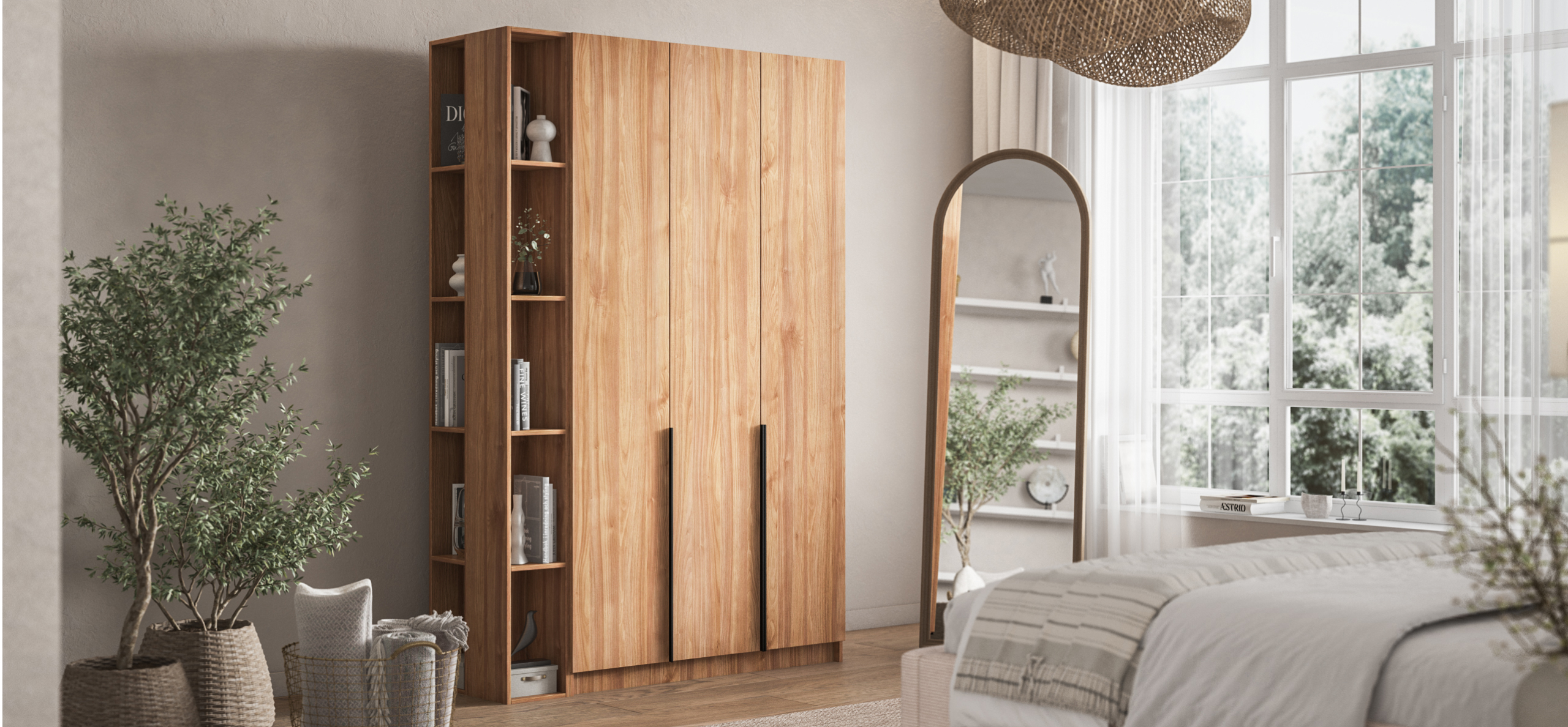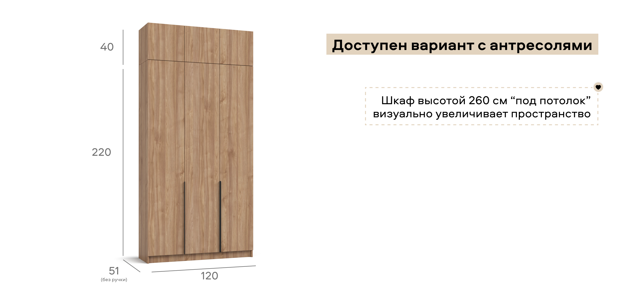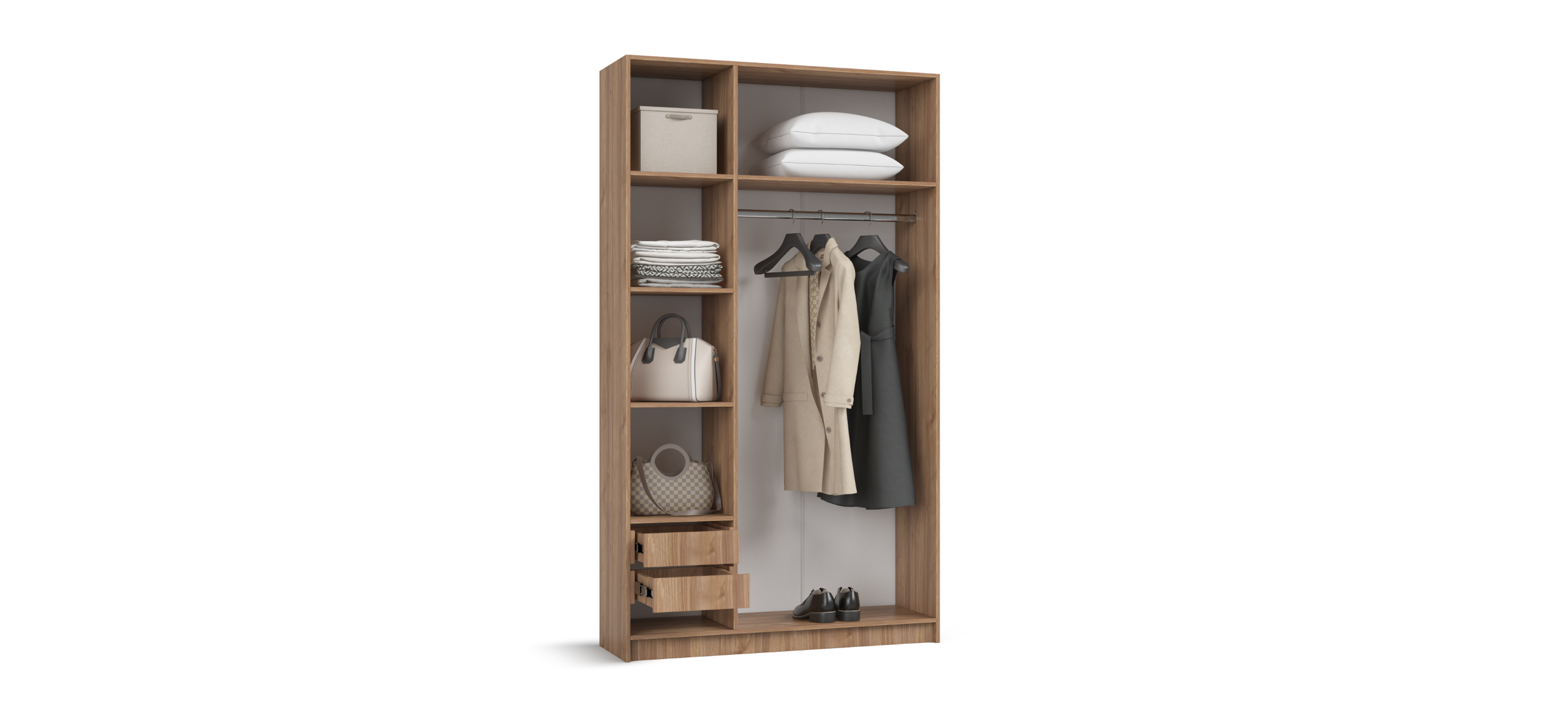 Гибкая компоновка превращает Рим 120 в личный конструктор хранения. Полки и два выдвижных ящика можно установить либо справа, либо слева — под планировку комнаты и ваши привычки. Ящики на шариковых направляющих выдвигаются плавно и бесшумно, а створки открываются лёгким движением, не отвлекая от утренней рутины.
