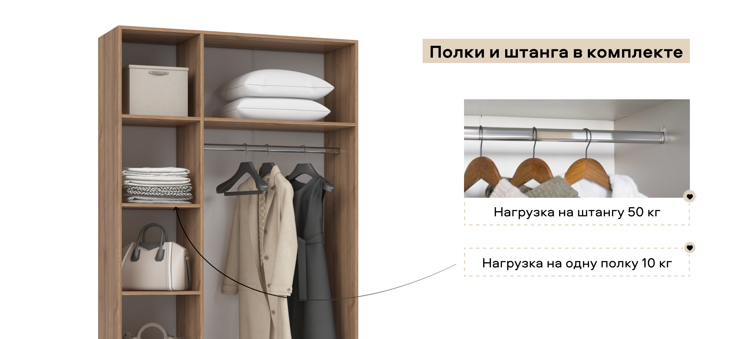 Полки и ящики можно установить с любой стороны — справа или слева. Шкаф адаптируется под вашу планировку и привычки, обеспечивая комфорт в использовании