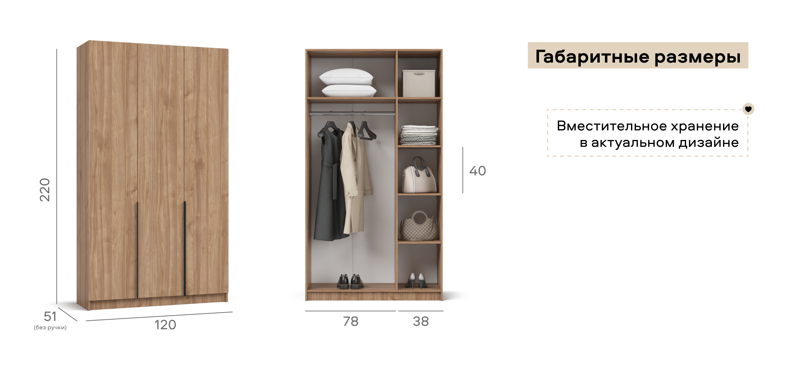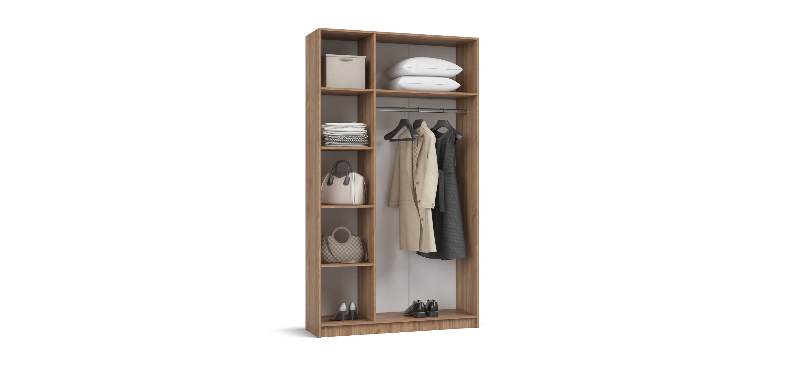 Полки и штанга могут располагаться как справа, так и слева, создавая удобную компоновку без лишних перестановок. Двери открываются мягко и бесшумно, превращая утренний сбор в приятно-тихий ритуал. Корпус из ЛДСП Е1 устойчив к износу и безопасен для домашнего воздуха, а аккуратно отделанная задняя стенка позволяет разместить шкаф не только у стены, но и в свободной планировке.
