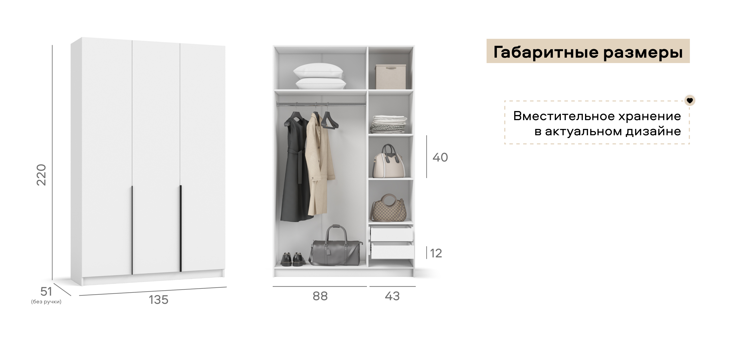 Шкаф Рим 135 — современный ответ на главный запрос городской квартиры: хранить много, занимая мало. Лаконичный фасад с удлинёнными чёрными ручками отсылает к актуальной эстетике 2025 года и делает шкаф ярким акцентом в любом интерьере — от сканди до неоклассики. Внутри продуман каждый сантиметр: просторное отделение легко принимает сезонный гардероб, коробки с обувью и постельное бельё, сохраняя порядок и освобождая комнату от лишних вещей.