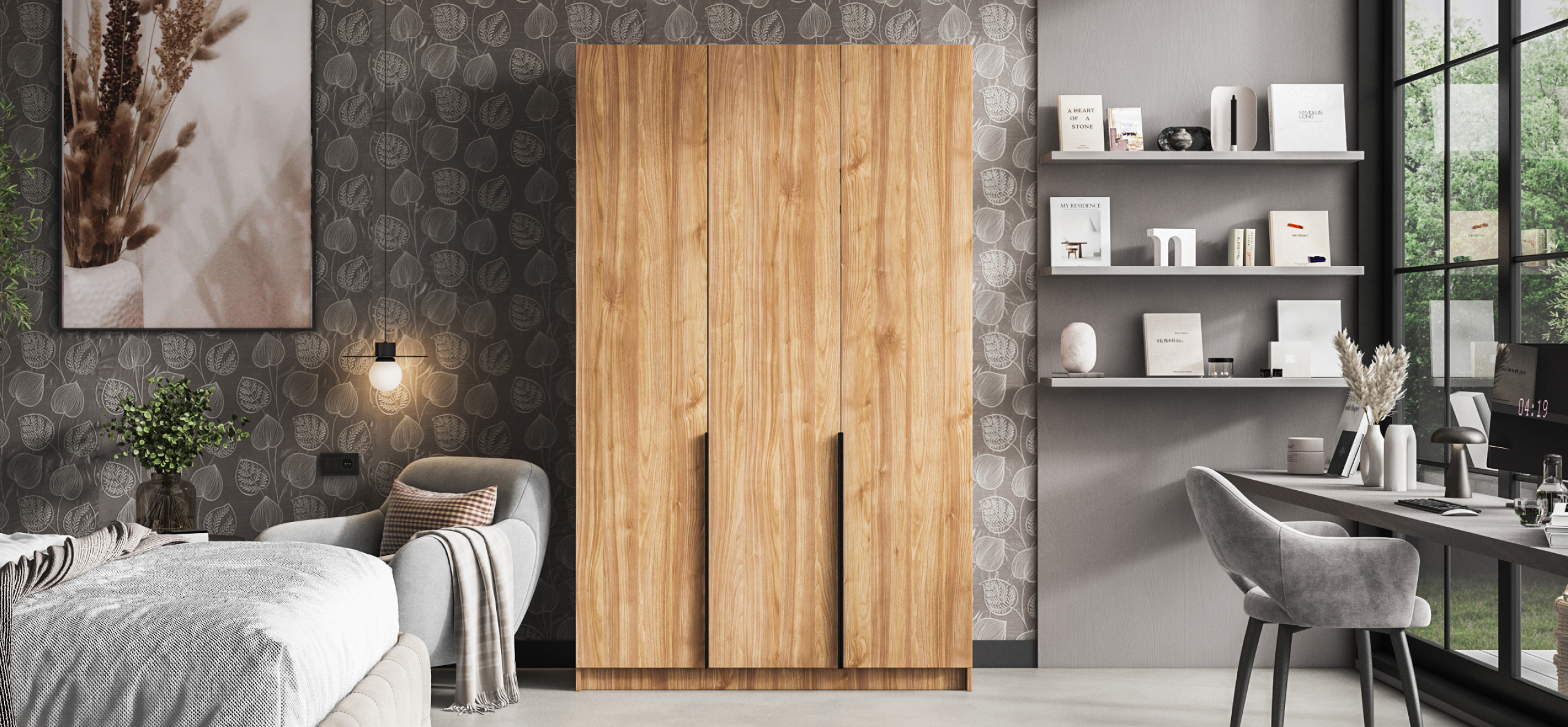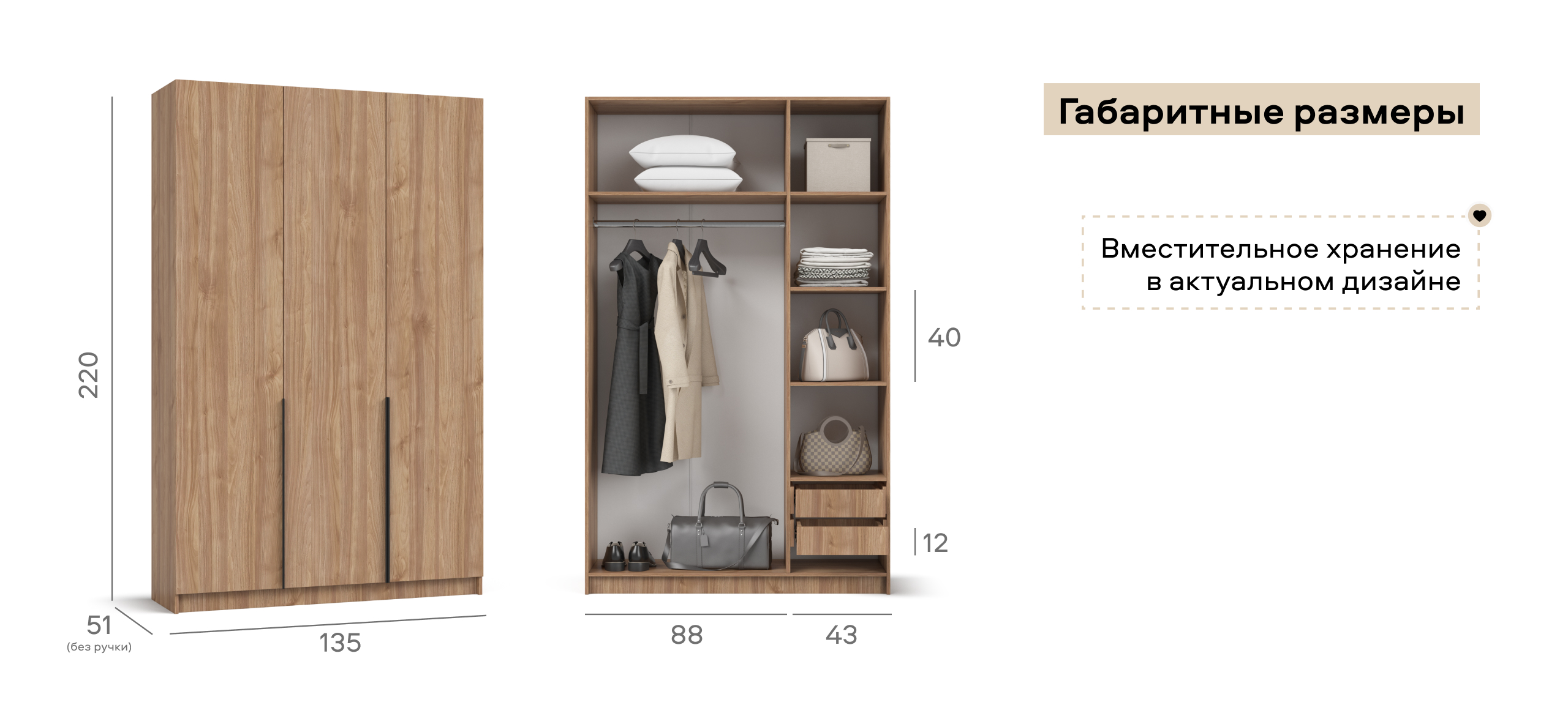 Шкаф Рим 135 — современный ответ на главный запрос городской квартиры: хранить много, занимая мало. Лаконичный фасад с удлинёнными чёрными ручками отсылает к актуальной эстетике 2025 года и делает шкаф ярким акцентом в любом интерьере — от сканди до неоклассики. Внутри продуман каждый сантиметр: просторное отделение легко принимает сезонный гардероб, коробки с обувью и постельное бельё, сохраняя порядок и освобождая комнату от лишних вещей.