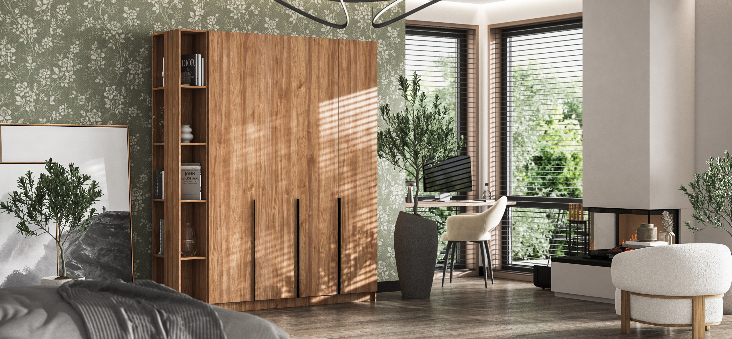 По бокам — две симметричные секции с полками на всю высоту, а в центре — штанга для длинной одежды. Такая компоновка экономит время на поиск вещей и избавляет от необходимости выбирать, какая сторона «главная». Полки выдерживают серьёзную нагрузку, а створки открываются плавным движением, не нарушая утренний ритм.