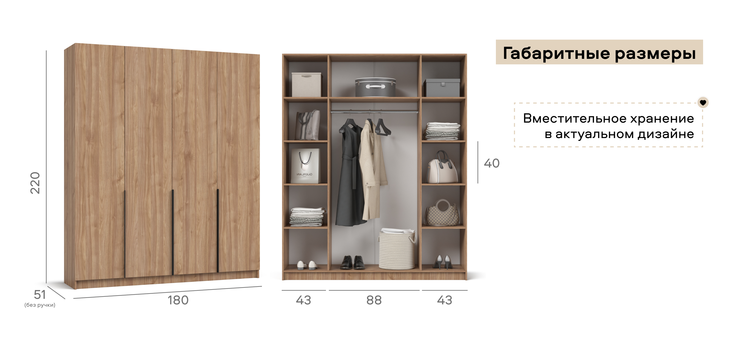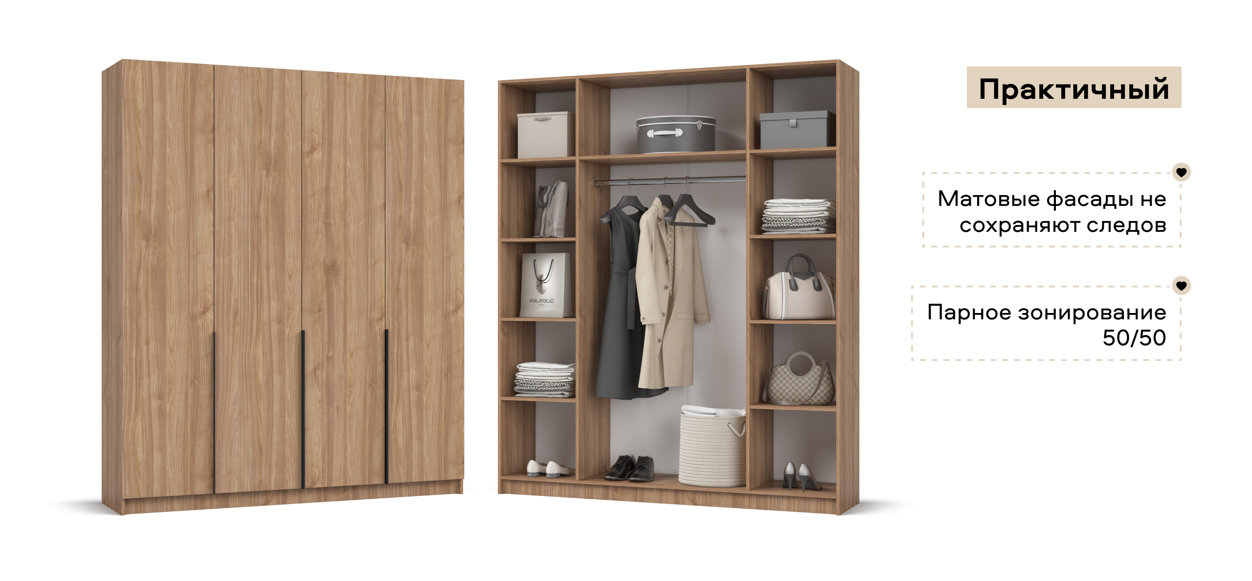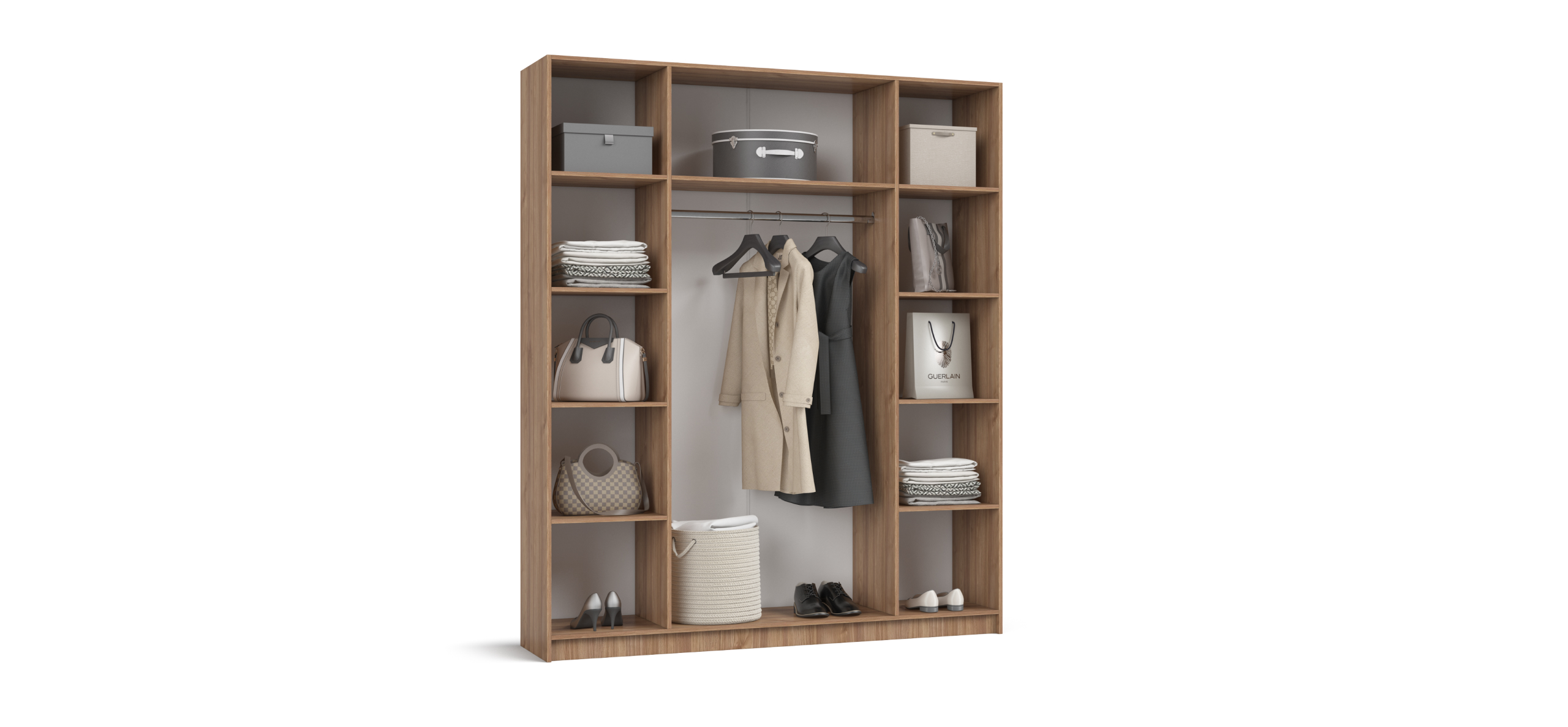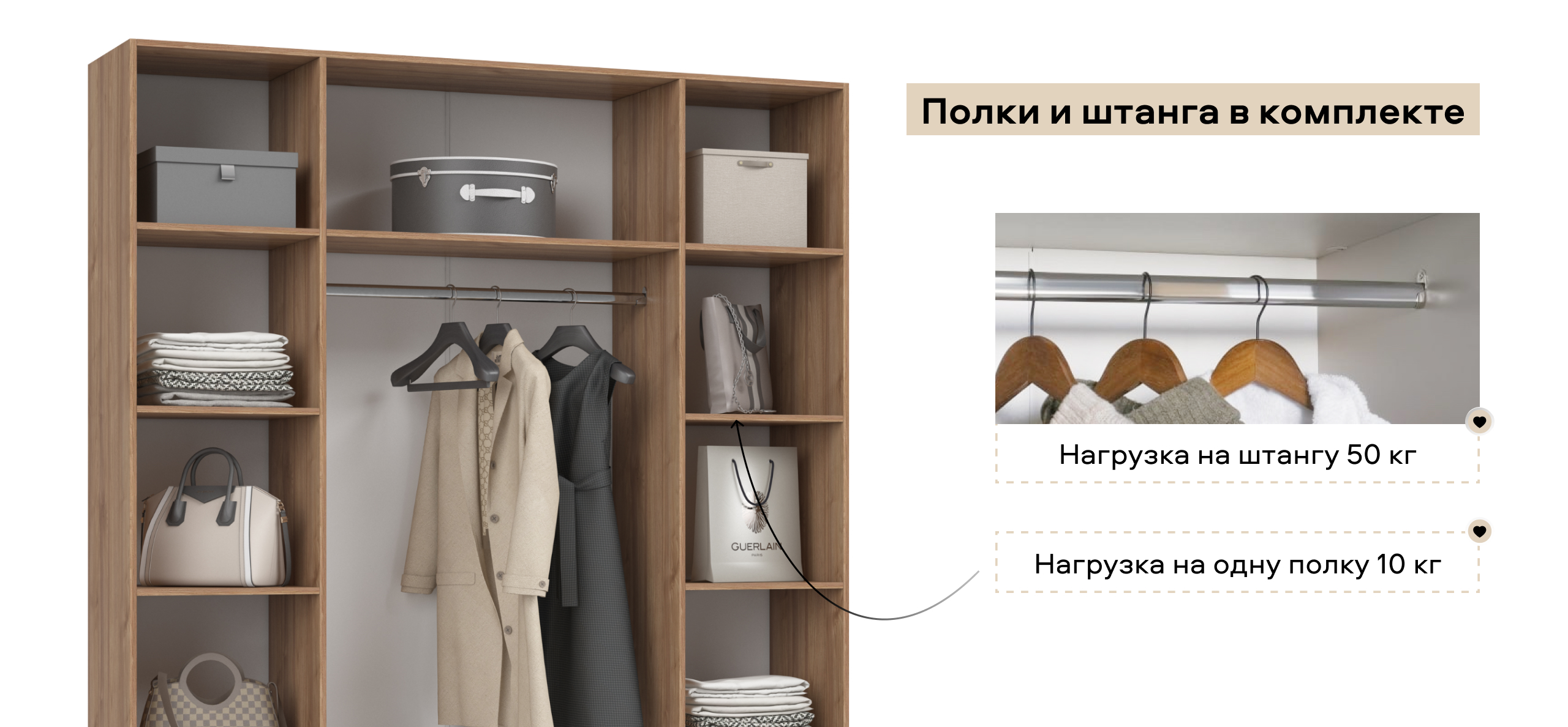 По бокам — две симметричные секции с полками на всю высоту, а в центре — штанга для длинной одежды. Такая компоновка экономит время на поиск вещей и избавляет от необходимости выбирать, какая сторона «главная». Полки выдерживают серьёзную нагрузку, а створки открываются плавным движением, не нарушая утренний ритм.