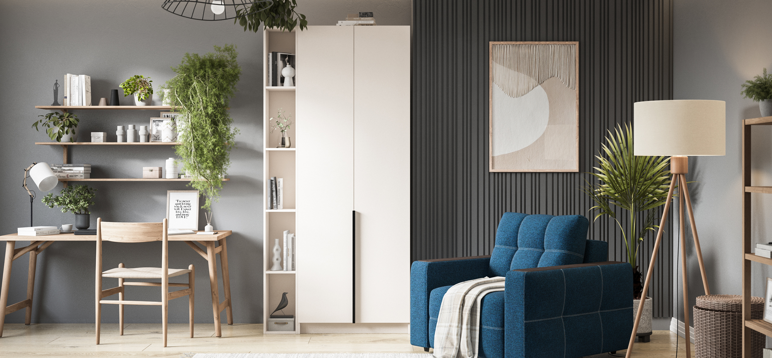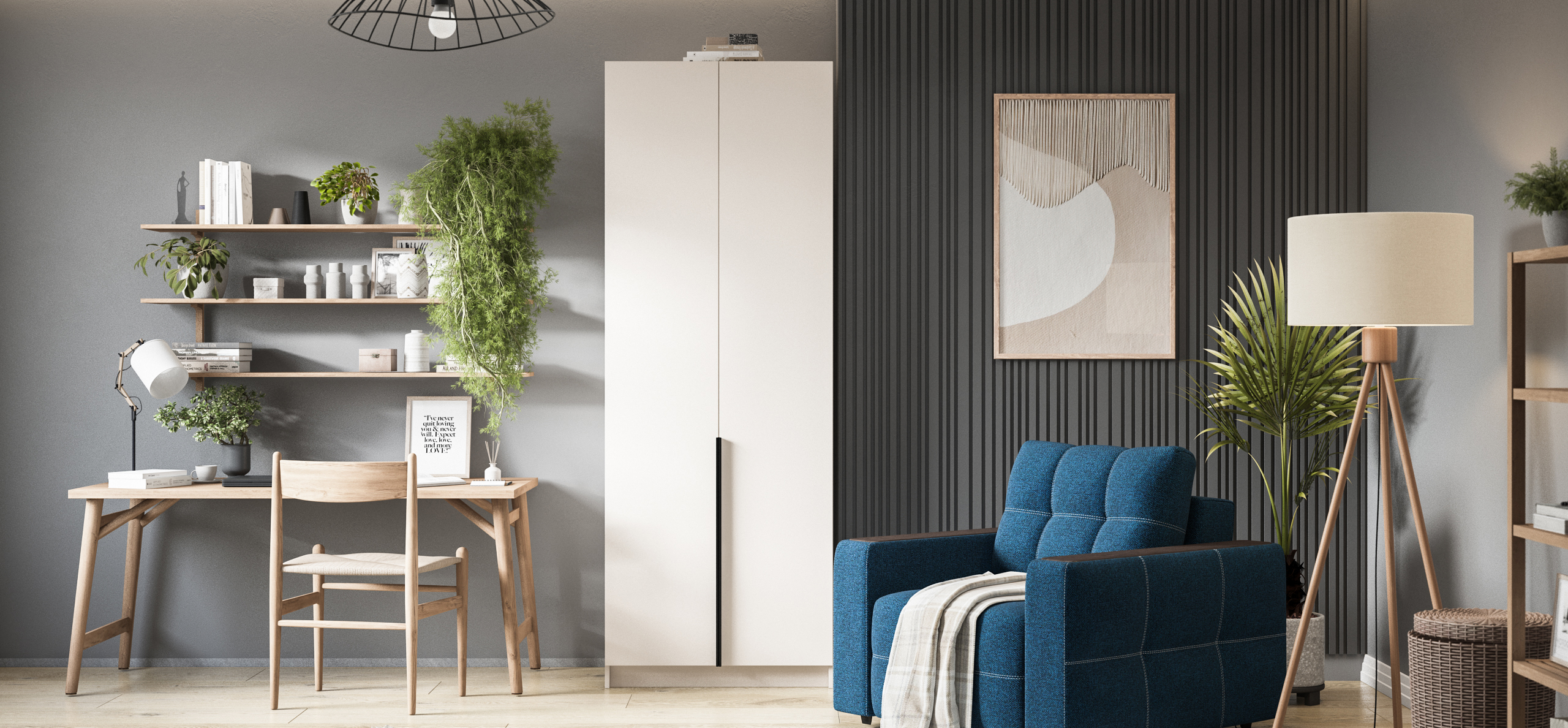 Шкаф Рим 80 — компактный ответ на главный запрос городской квартиры: хранить нужное, сохраняя максимум свободного пространства. Лаконичный фасад с удлинёнными чёрными ручками отсылает к актуальной эстетике 2025 года и делает шкаф ярким акцентом любого интерьера — от сканди до неоклассики. Внутри продуман каждый сантиметр: аккуратное отделение легко принимает базовый гардероб, коробки с обувью и текстиль, поддерживая порядок и избавляя комнату от лишних вещей.