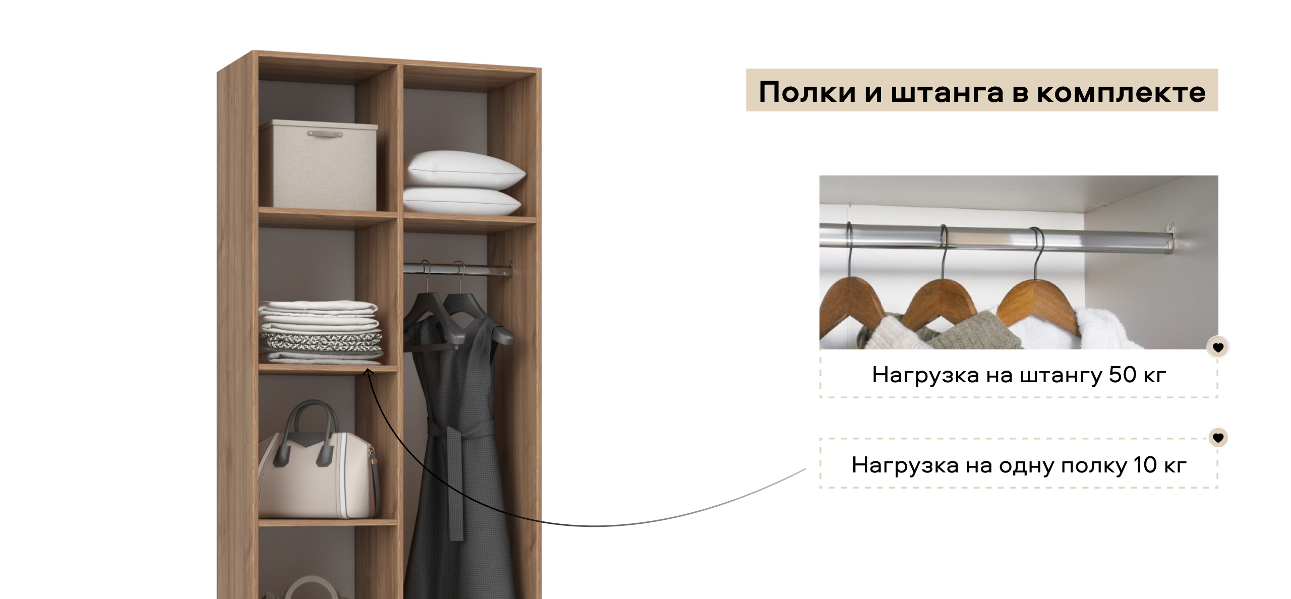 Полки и ящики можно установить с любой стороны — справа или слева. Шкаф адаптируется под вашу планировку и привычки, обеспечивая комфорт в использовании
