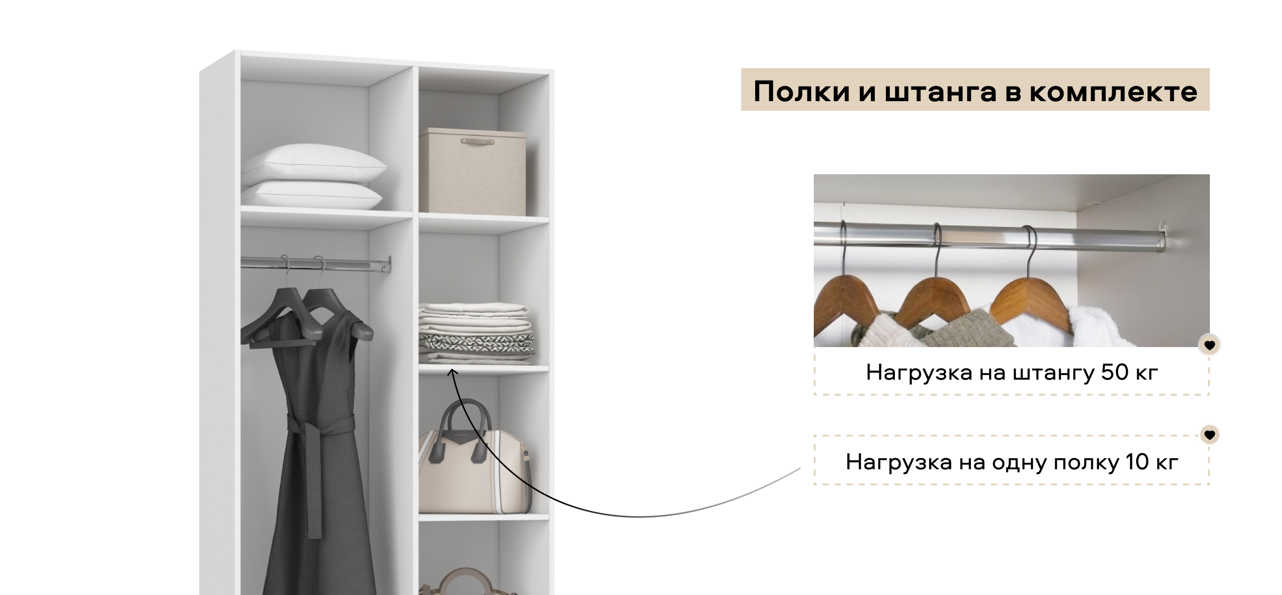 Полки и ящики можно установить с любой стороны — справа или слева. Шкаф адаптируется под вашу планировку и привычки, обеспечивая комфорт в использовании