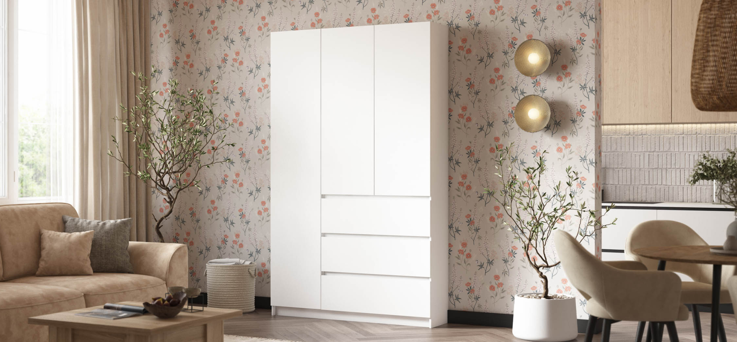 Шкаф становится чётко и ровно на любом покрытии: линии сходятся, зазоры аккуратные, двери ходят тихо и стабильно. Материалы — практичные и безопасные для дома (ЛДСП Е1), кромки аккуратно обработаны, чтобы внешний вид держался годами.
