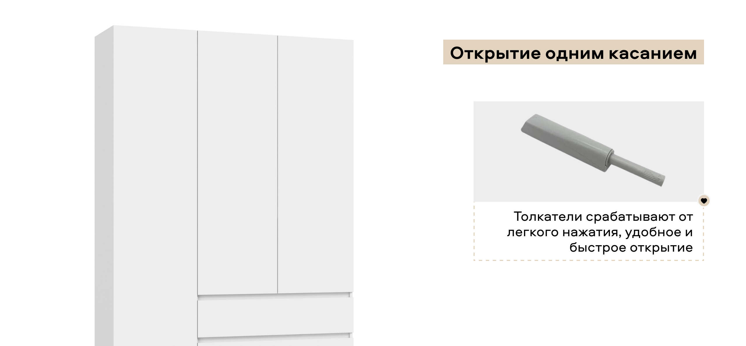 Открытие одним касанием. Толкатели срабатывают от лёгкого нажатия — удобно, когда заняты руки. Фасады без ручек остаются чище и визуально спокойнее.