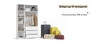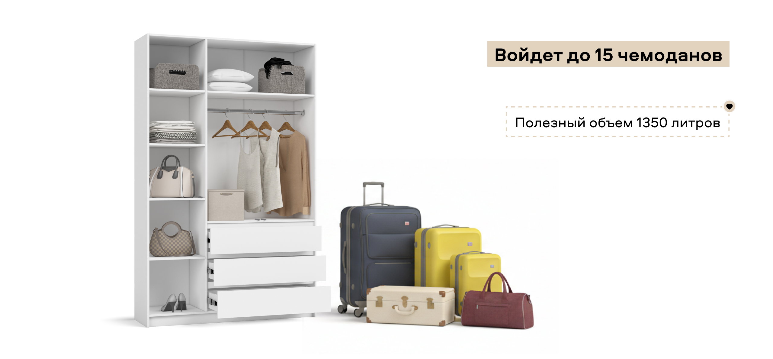 Когда руки заняты — лёгкое касание, и дверь мягко поддаётся. Внутри — ясная логика хранения: блок выдвижных ящиков работает как «мини-комод», помогает быстро разложить бельё и мелочи, а основной объём уверенно берёт на себя содержимое 15 крупных чемоданов — гардероб, обувные коробки, постельное.
