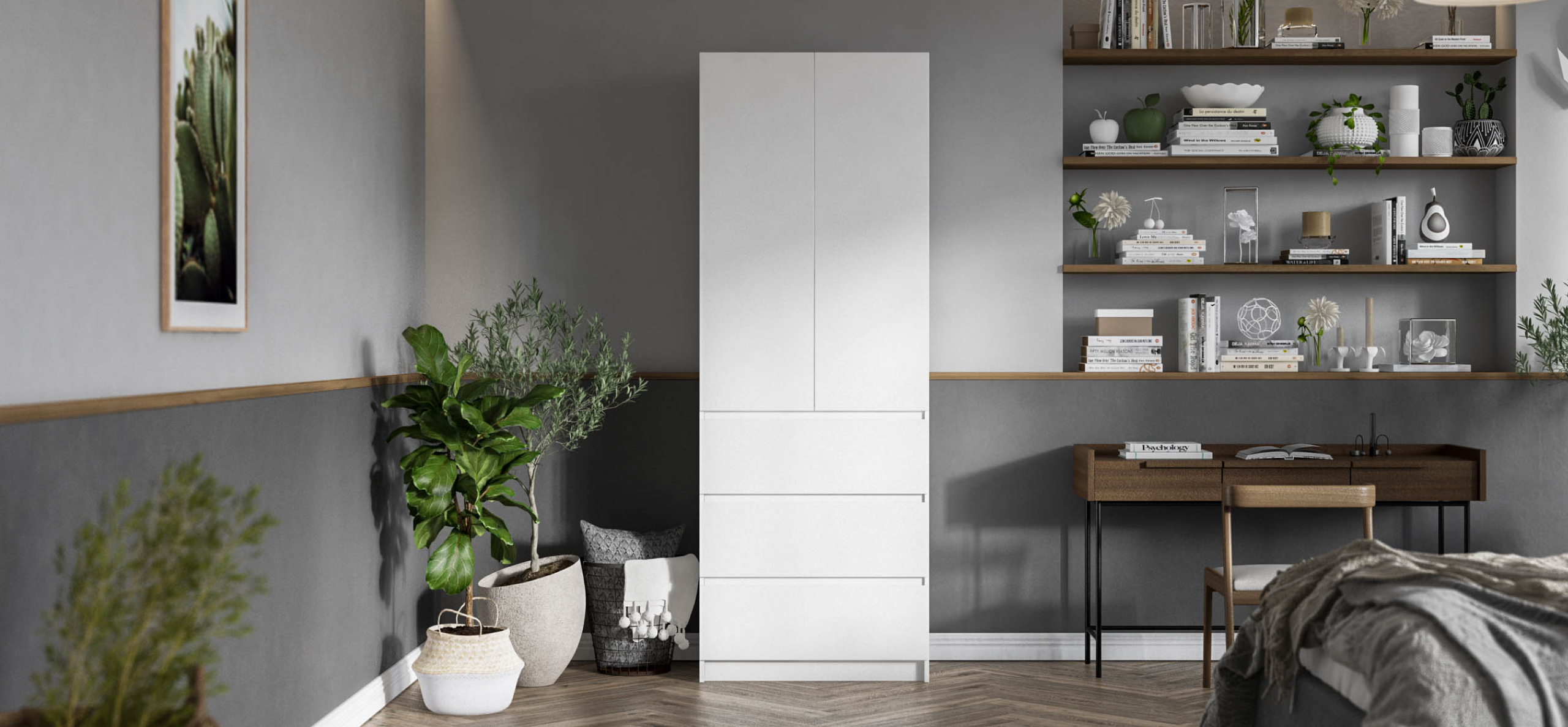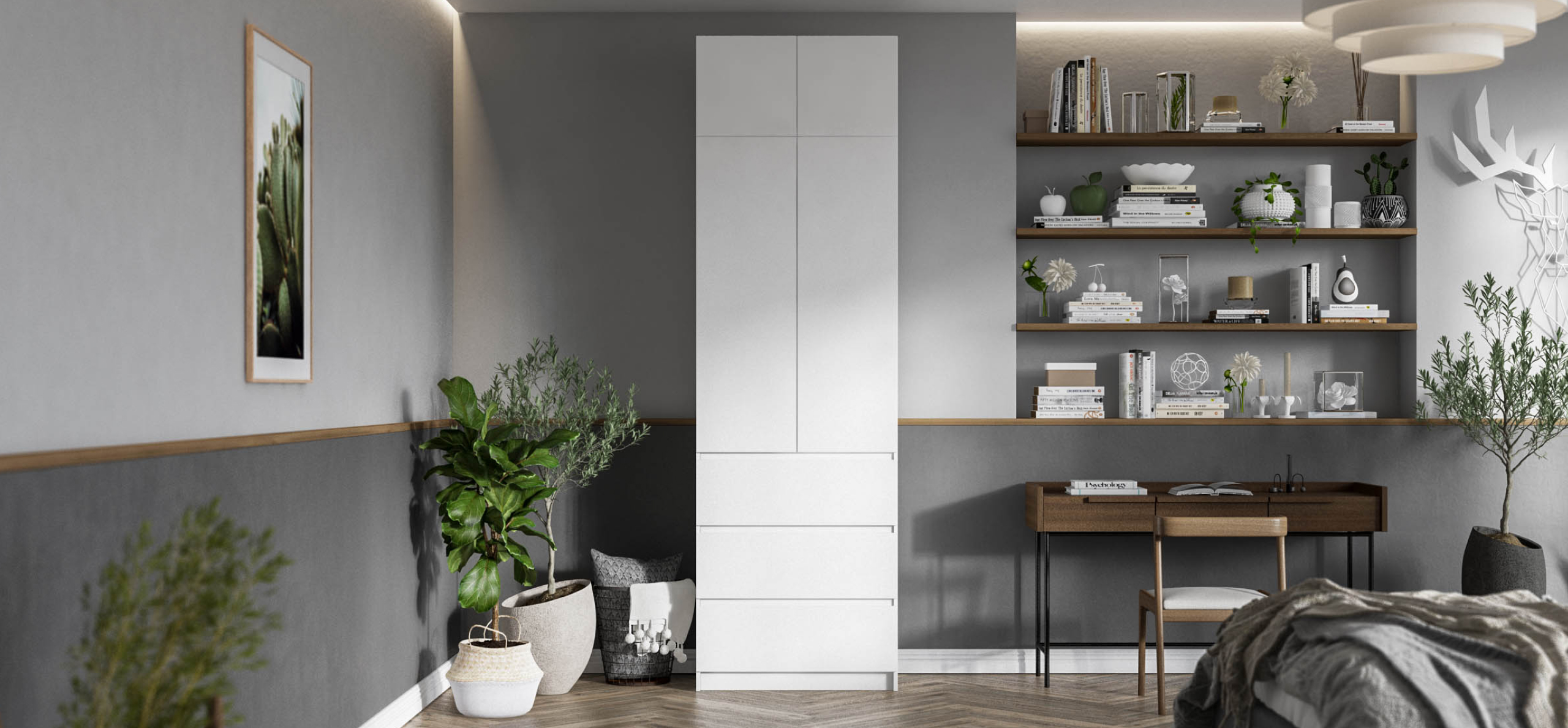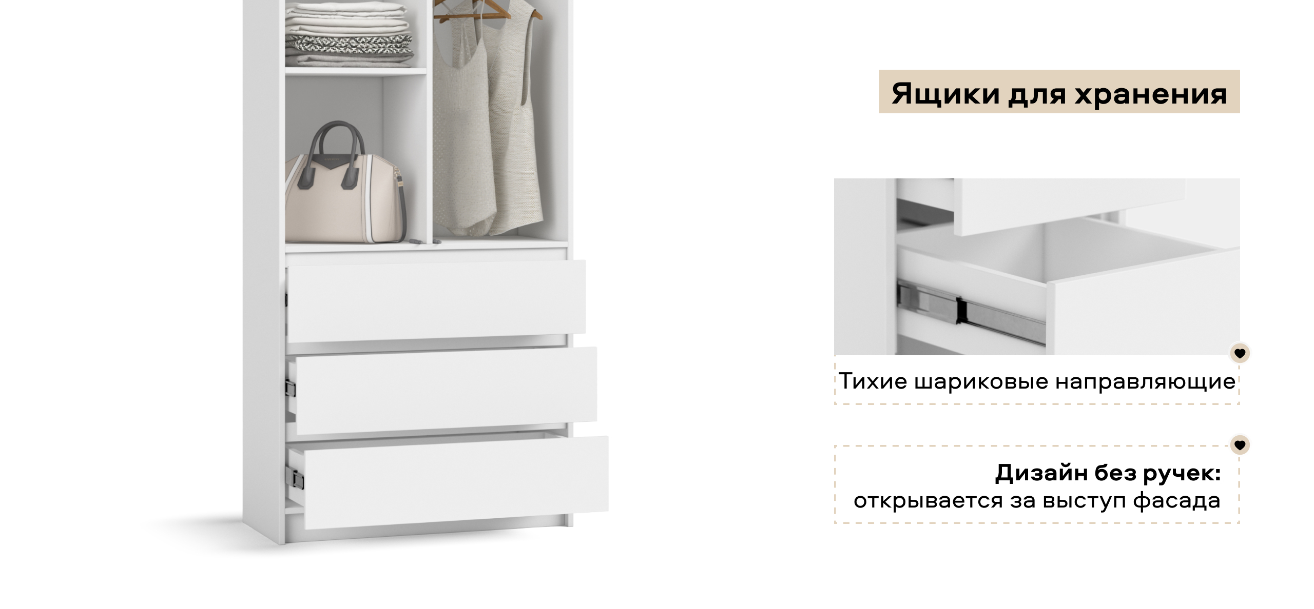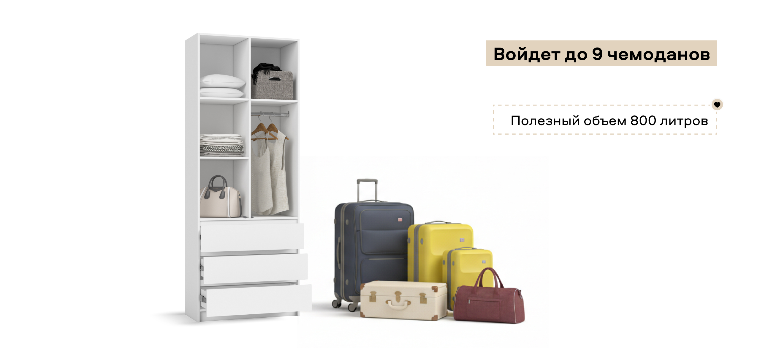 Когда руки заняты — лёгкое касание, и дверь мягко поддаётся. Внутри — ясная логика хранения: блок выдвижных ящиков работает как «мини-комод», помогает быстро разложить бельё и мелочи, а основной объём уверенно берёт на себя содержимое 9 крупных чемоданов — гардероб, обувные коробки, постельное.