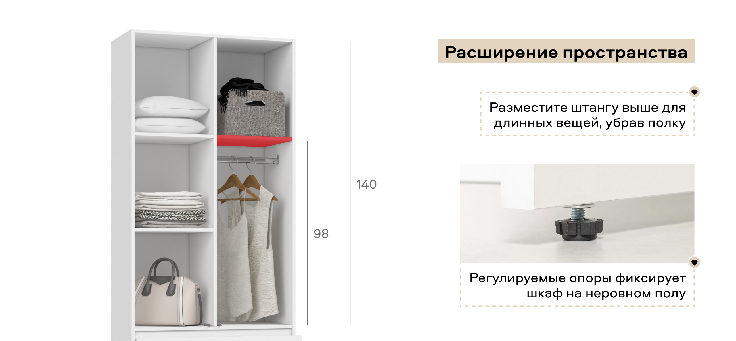 Регулируемые опоры. Быстрое выравнивание на любом полу (ламинат, плитка, стяжка) сохраняет точную геометрию корпуса: зазоры ровные, двери не перекашиваются. Регулировка проста и повторяемая — удобно при перестановке.