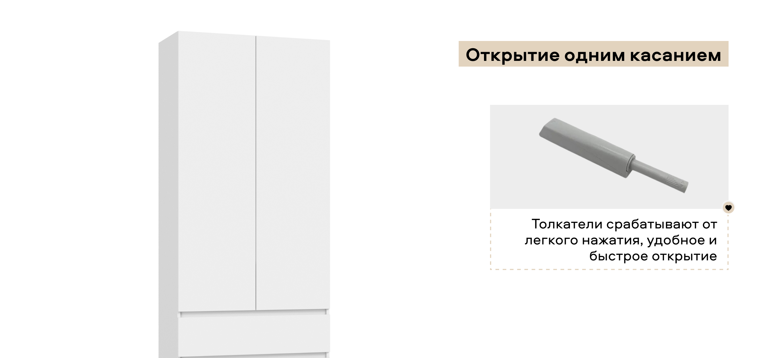 Открытие одним касанием. Толкатели срабатывают от лёгкого нажатия — удобно, когда заняты руки. Фасады без ручек остаются чище и визуально спокойнее.