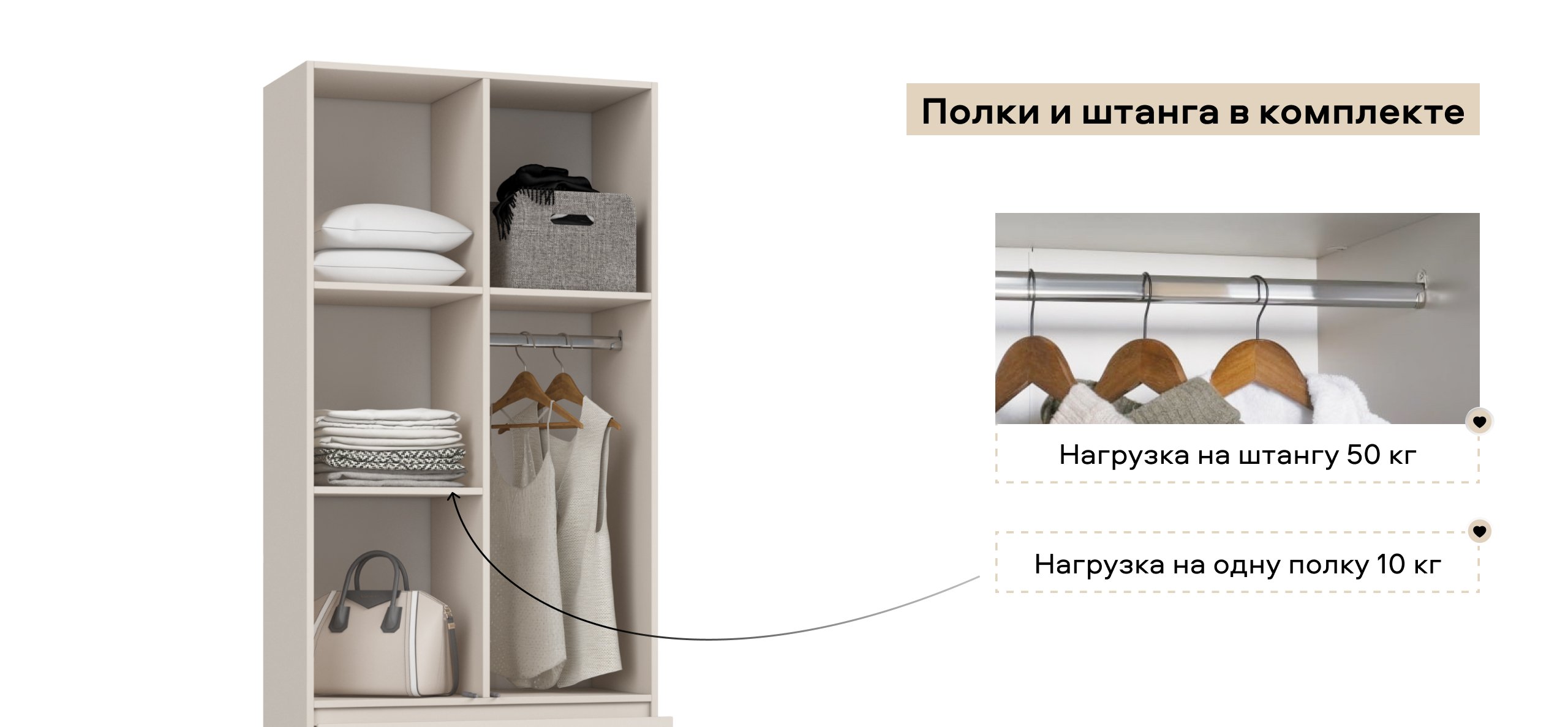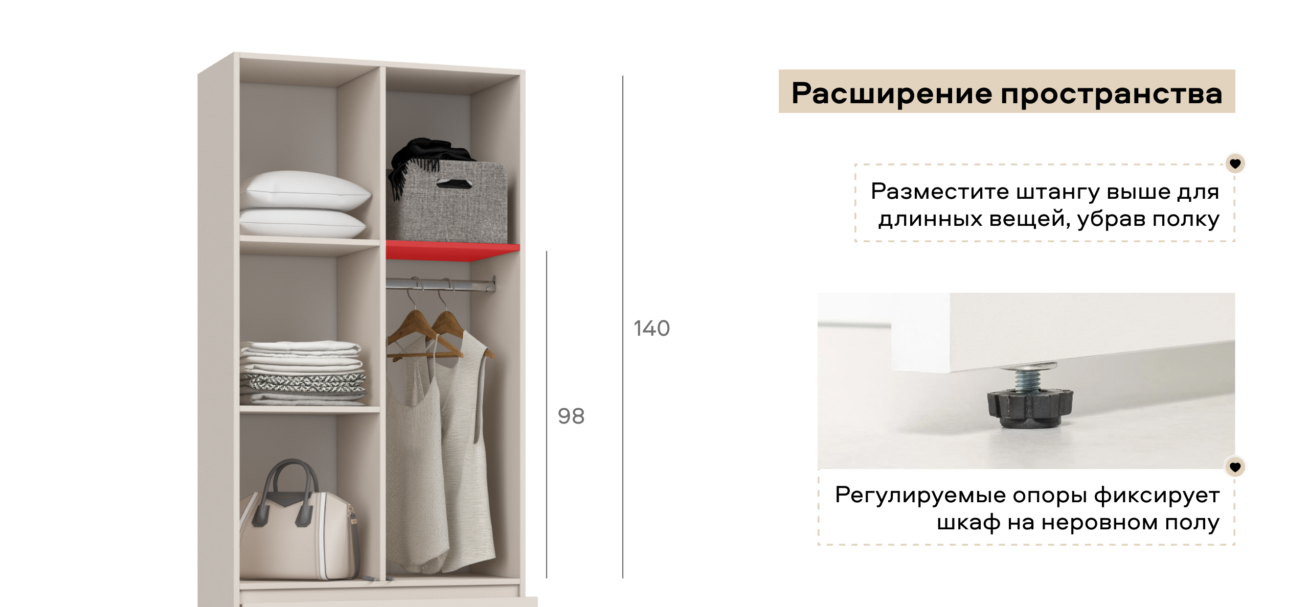 Регулируемые опоры. Быстрое выравнивание на любом полу (ламинат, плитка, стяжка) сохраняет точную геометрию корпуса: зазоры ровные, двери не перекашиваются. Регулировка проста и повторяемая — удобно при перестановке.