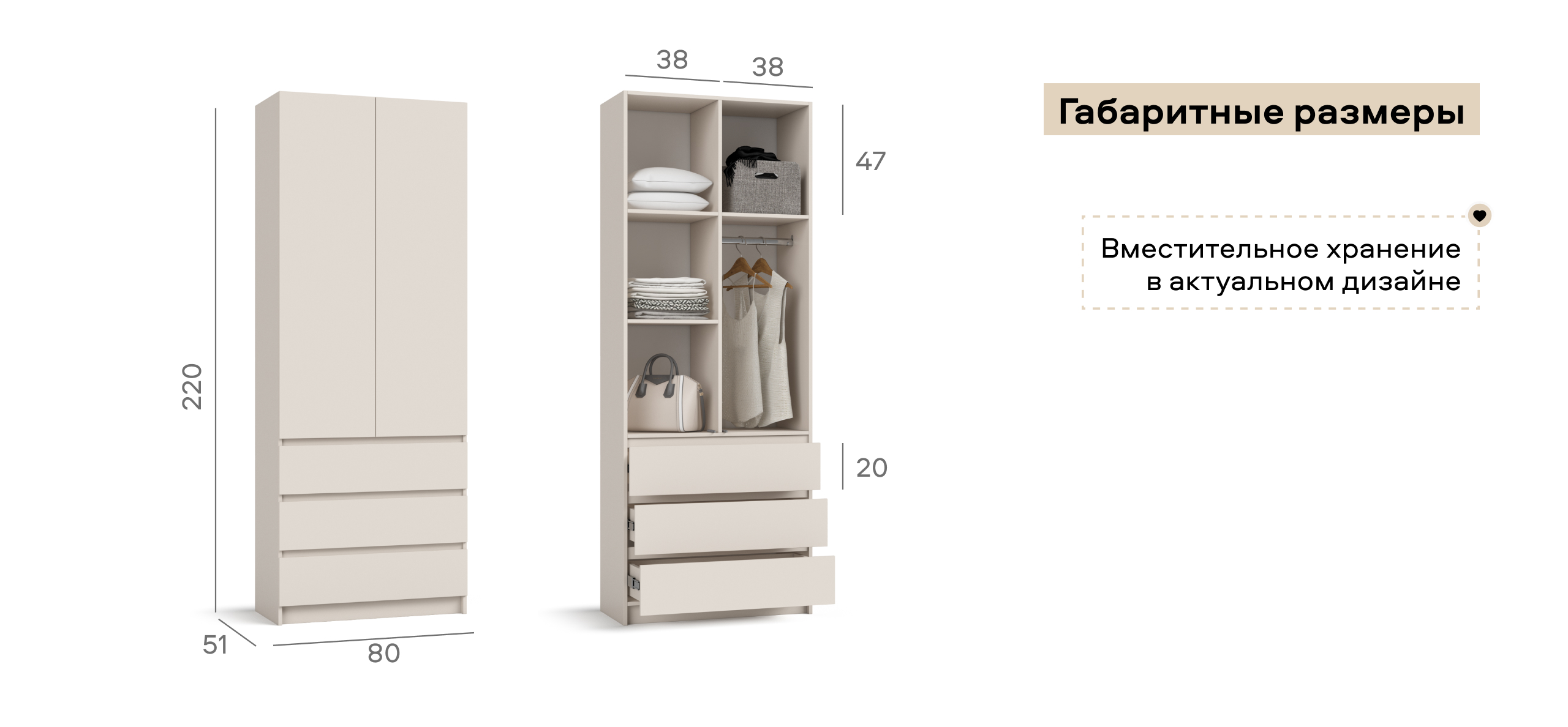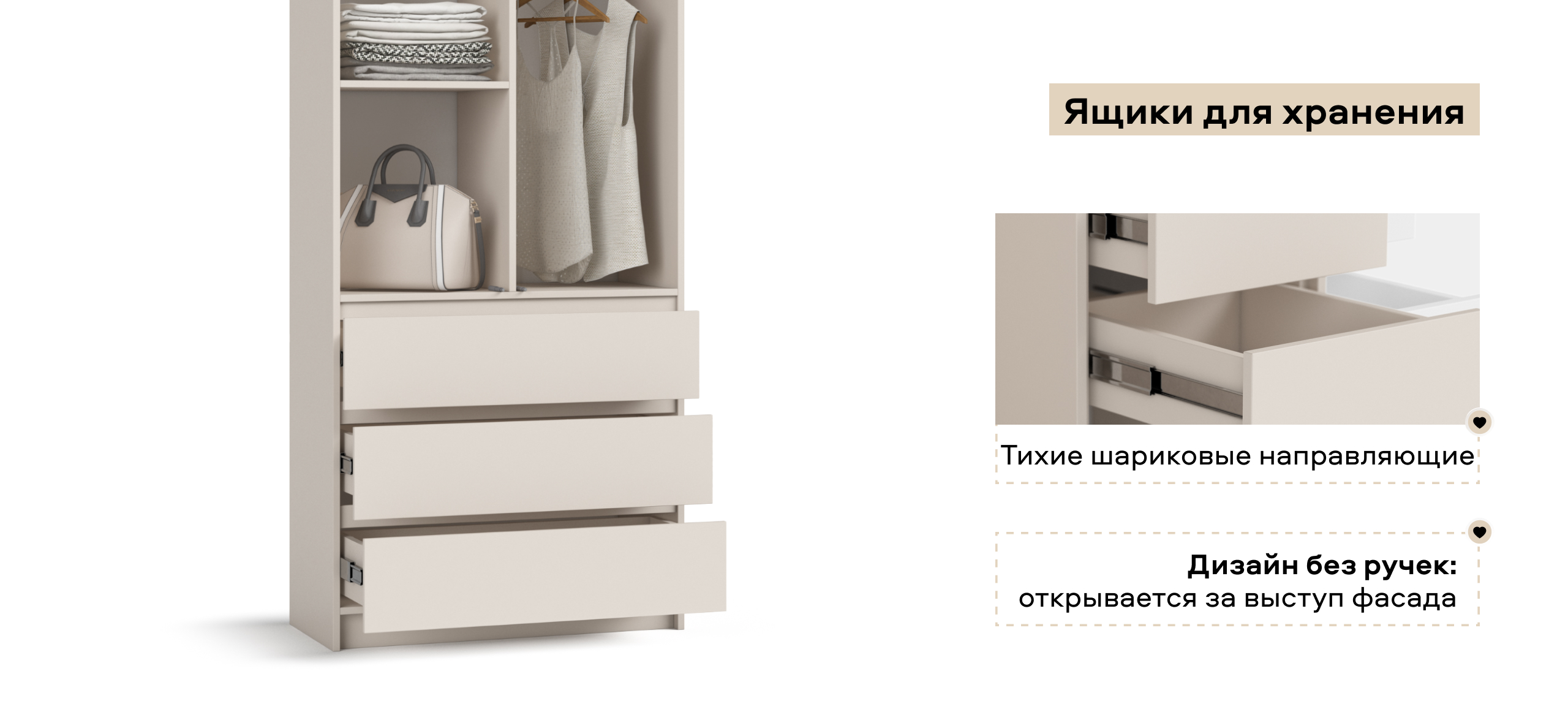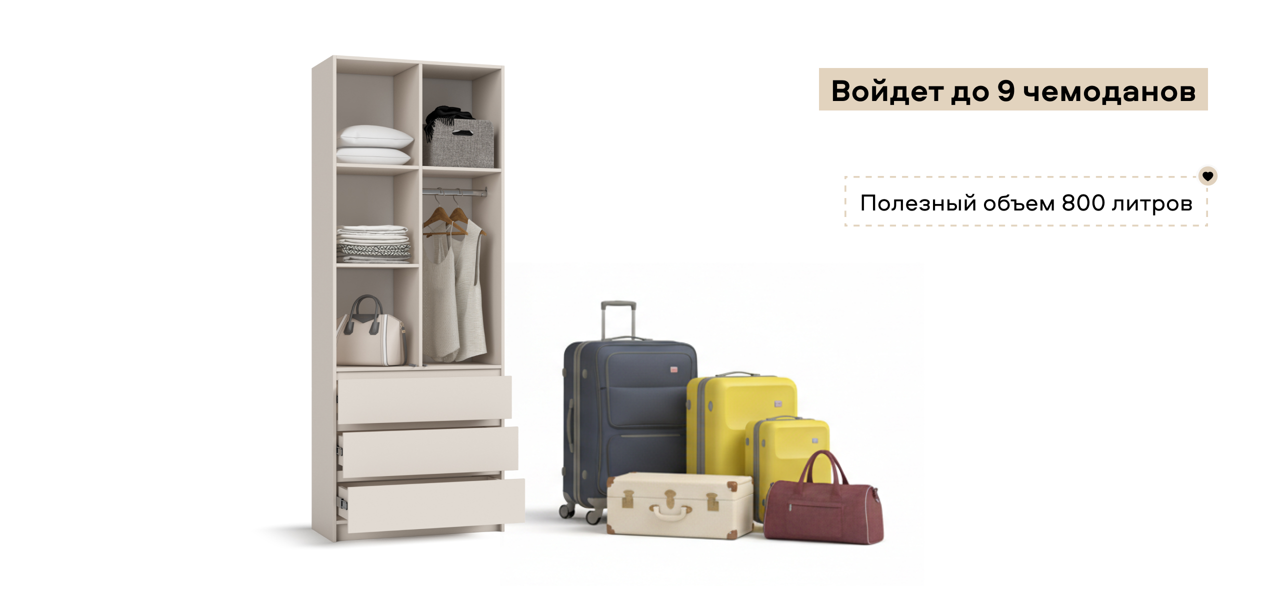 Когда руки заняты — лёгкое касание, и дверь мягко поддаётся. Внутри — ясная логика хранения: блок выдвижных ящиков работает как «мини-комод», помогает быстро разложить бельё и мелочи, а основной объём уверенно берёт на себя содержимое 9 крупных чемоданов — гардероб, обувные коробки, постельное.