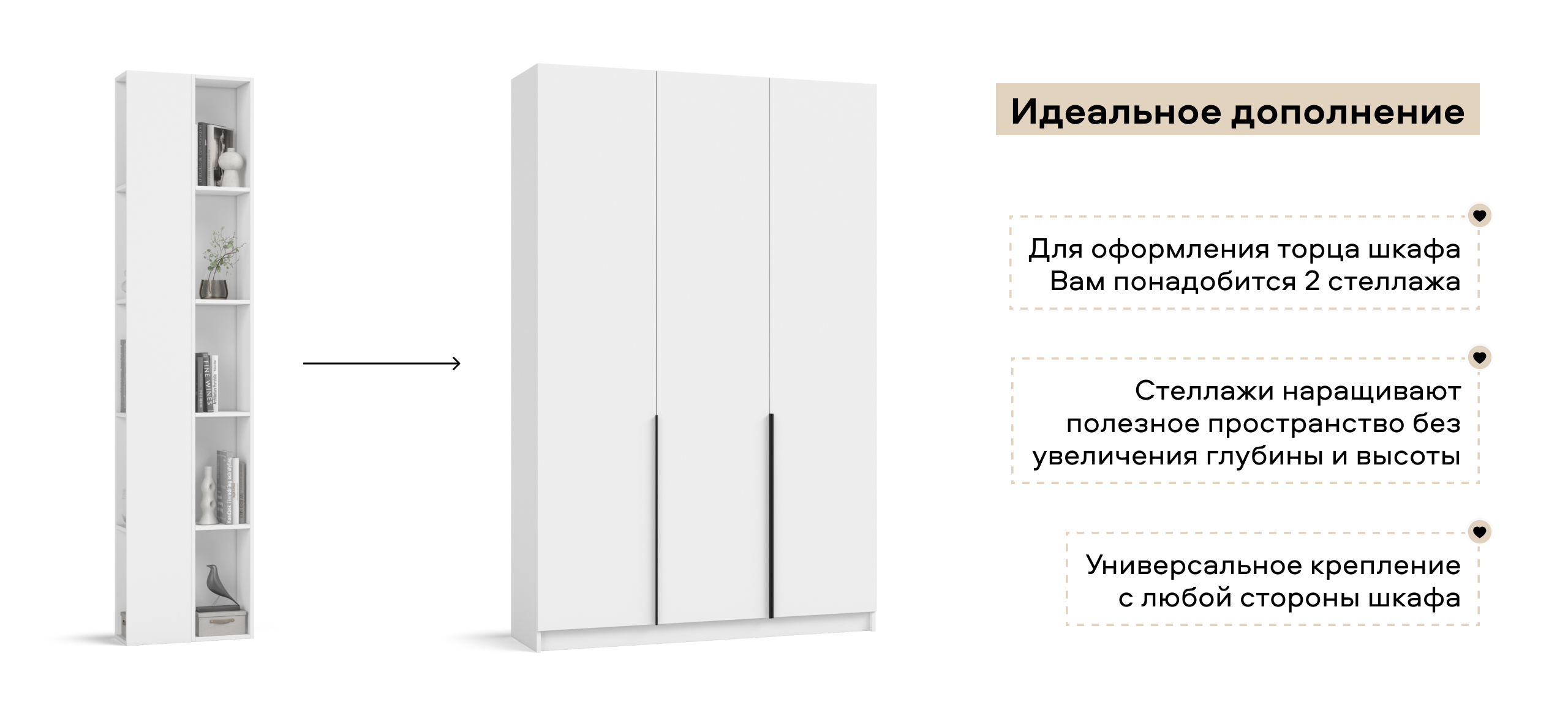 Стеллажи Рим 2.0 — естественное продолжение серии шкафов: они идеально совпадают по глубине и крепятся к корпусу, образуя единую, выверенную линию мебели.