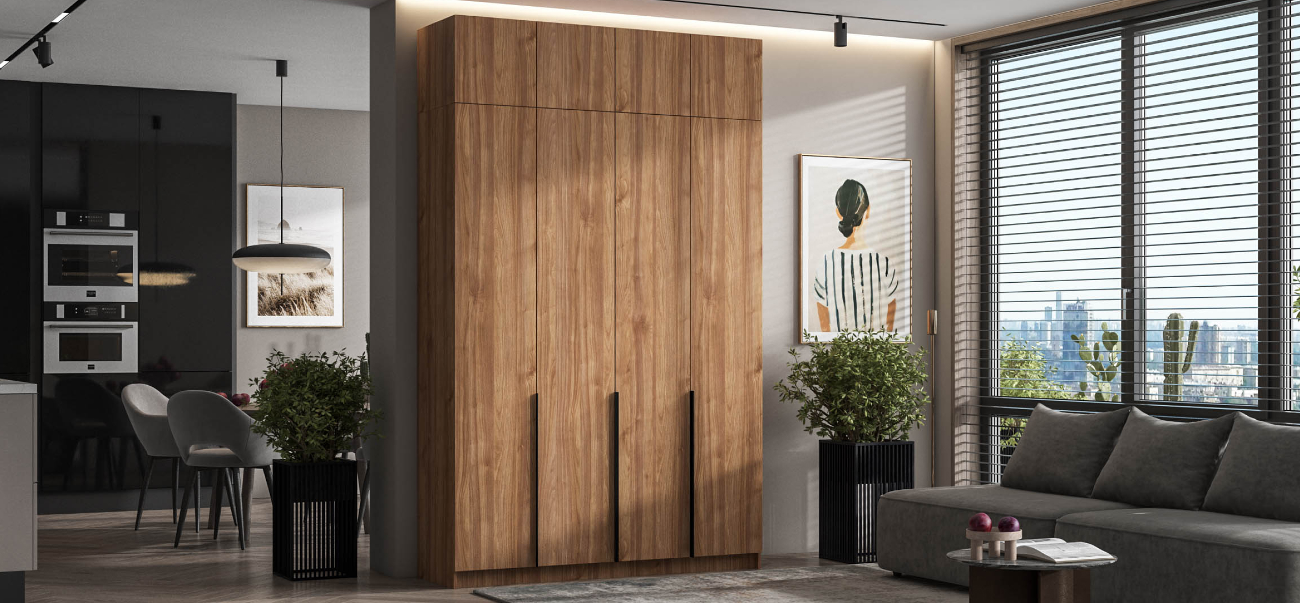 Открывайте фасады лёгким касанием — скрытые толкатели работают бесшумно, даря ощущение заботы о каждом жесте. Храните книги, декор или сезонные аксессуары так, чтобы они радовали глаз, а не собирали пыль.