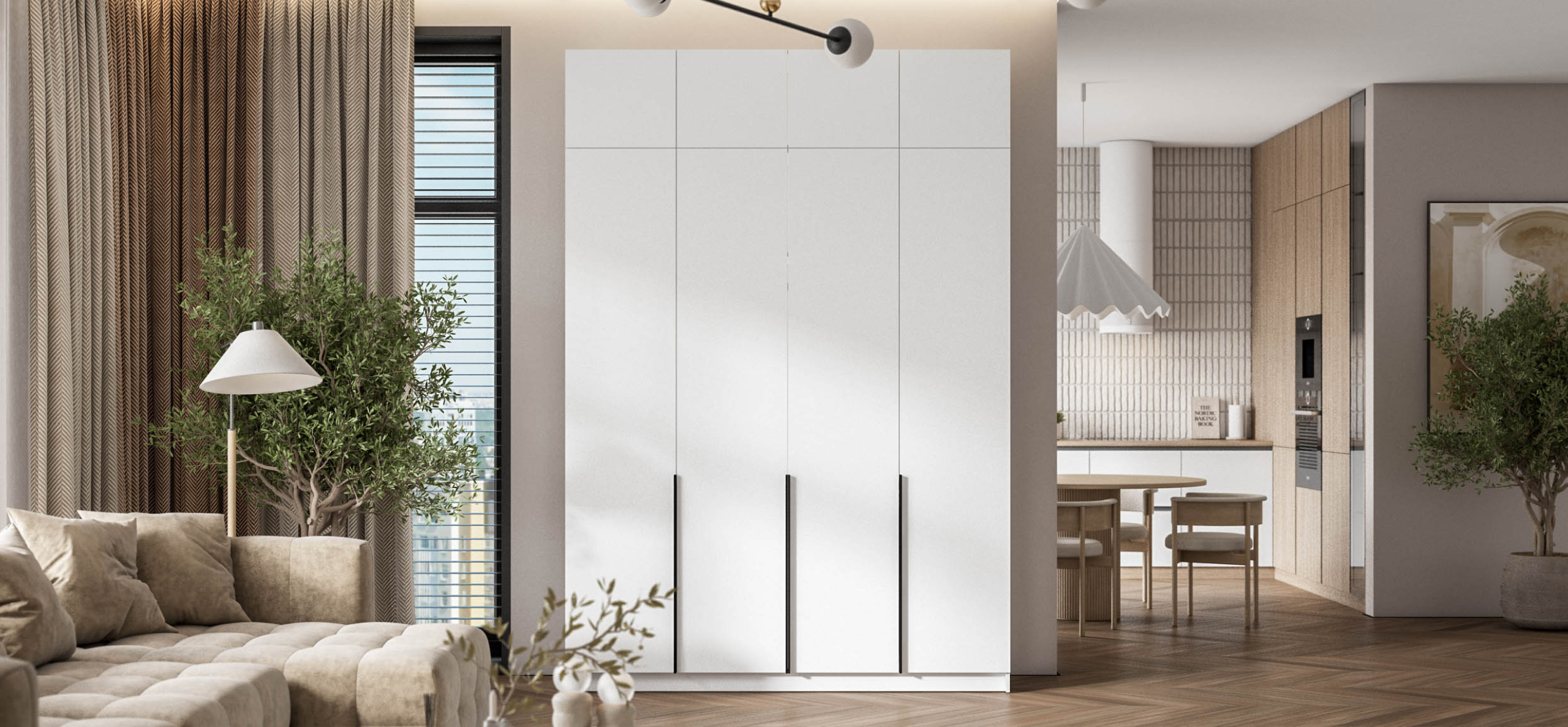 Открывайте фасады лёгким касанием — скрытые толкатели работают бесшумно, даря ощущение заботы о каждом жесте. Храните книги, декор или сезонные аксессуары так, чтобы они радовали глаз, а не собирали пыль.