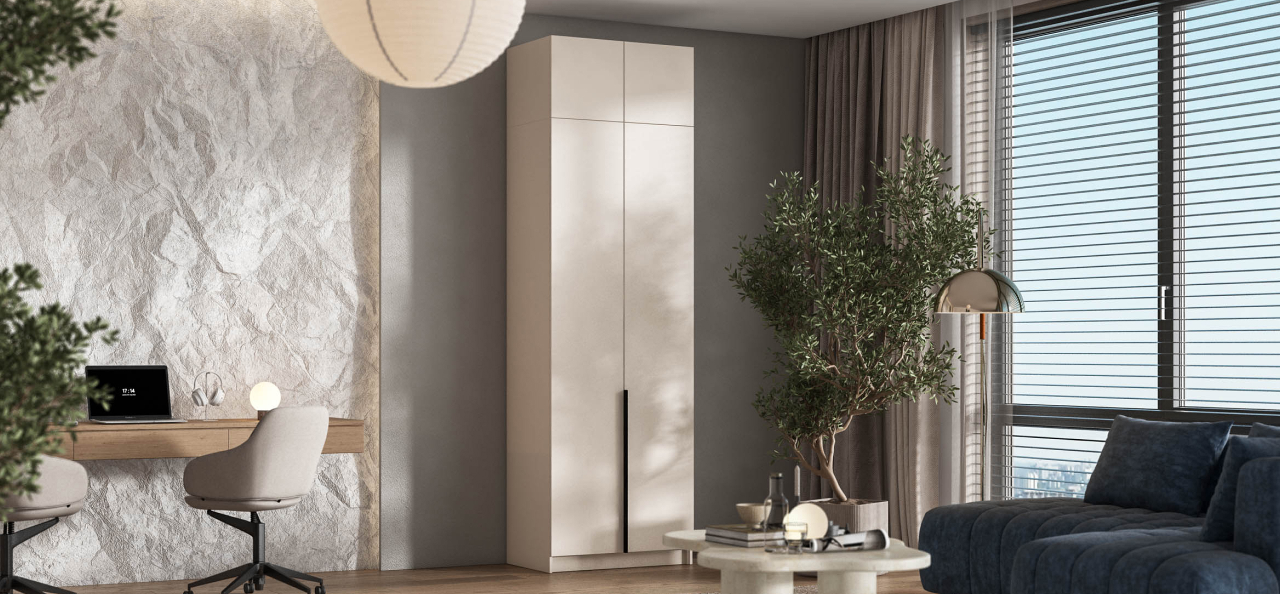 Открывайте фасады лёгким касанием — скрытые толкатели работают бесшумно, даря ощущение заботы о каждом жесте. Храните книги, декор или сезонные аксессуары так, чтобы они радовали глаз, а не собирали пыль.