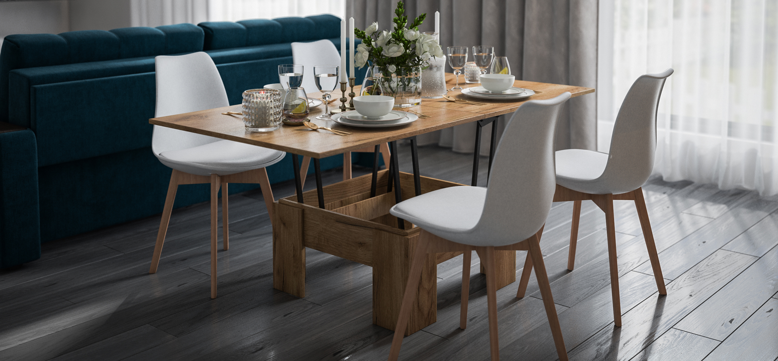 Стол-трансформер – практичное приобретение, выполняющее двойную функцию. В сложенном виде он служит журнальным или письменным столом, занимающим очень немного места в гостиной, а с разложенной столешницей превращается в обеденный стол на 8 персон. Стол оснащен надежным механизмом раскладки и улучшенными креплениями.