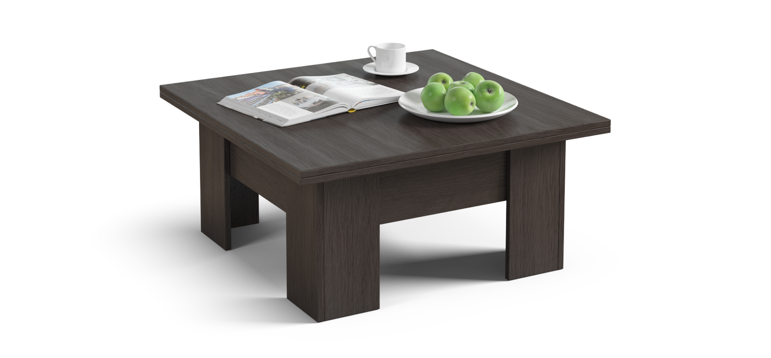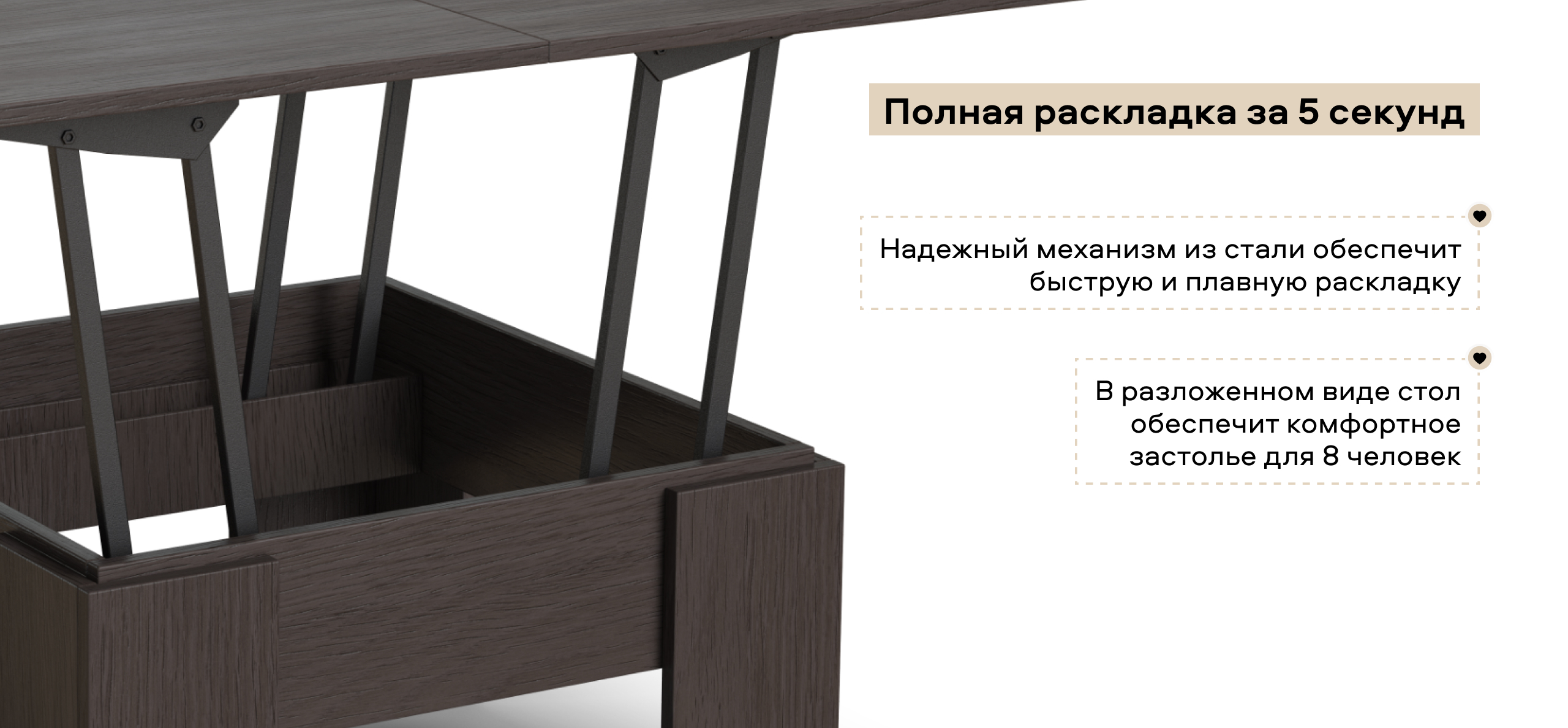 Стол-трансформер – практичное приобретение, выполняющее двойную функцию. В сложенном виде он служит журнальным или письменным столом, занимающим очень немного места в гостиной, а с разложенной столешницей превращается в обеденный стол на 8 персон. Стол оснащен надежным механизмом раскладки и улучшенными креплениями.